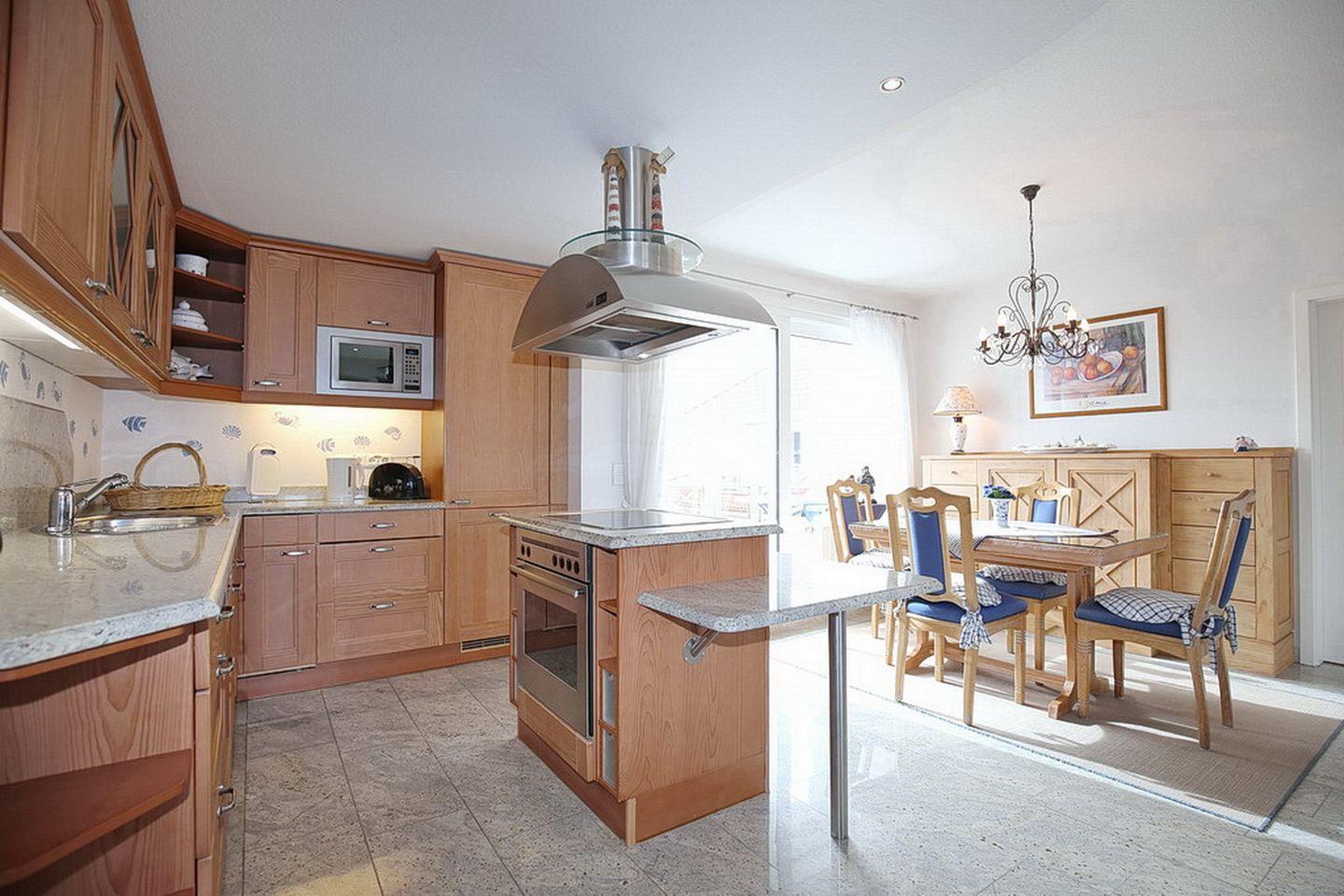Die modern eingerichtete Küche der Ferienwohnung besticht durch ihre freistehende Kochinsel und die sehr gute Ausstattung mit Kühlschrank inklusive Gefrierfach, Cerankochfeld, Herd und Spülmaschine. Das exklusive, geflieste Badezimmer verfügt über Dusche und Badewanne. Ebenfalls stehen dir hier eine Waschmaschine und ein Trockner zur Verfügung.
