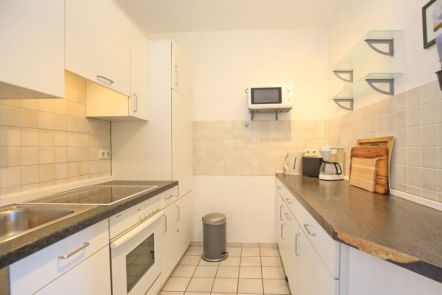 Die in den Wohnbereich integrierte Küche bietet einen Backofen, ein 4-Platten-Cerankochfeld, einen Geschirrspüler, einen Kühlschrank mit Gefrierfach und eine Mikrowelle. In einem großen Kleiderschrank auf dem Flur kannst du deine Garderobe aufbewahren. Der Boden im Badezimmer und der Küche ist mit Fliesen ausgelegt.