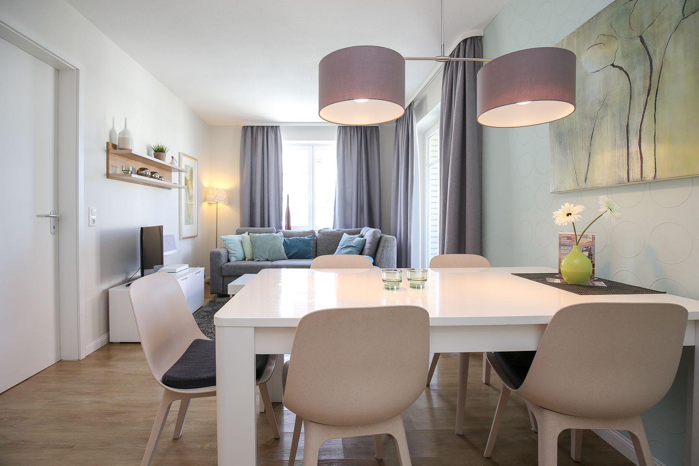 Der modern und offen gestaltete Wohn- und Essbereich bietet auf einer Couch mit Longchair und Schlaffunktion einen 5. Schlafplatz (120 x 200 cm). Zur Unterhaltung stehen ein neuer Smart TV und ein Blu-ray/DVD-Player mit einer kleinen Auswahl an Spielfilmen bereit. Die CD-Stereomusikanlage mit Radio dient gleichzeitig als Dockingstation mit Aufladefunktion für iPad/iPhone/iPod.