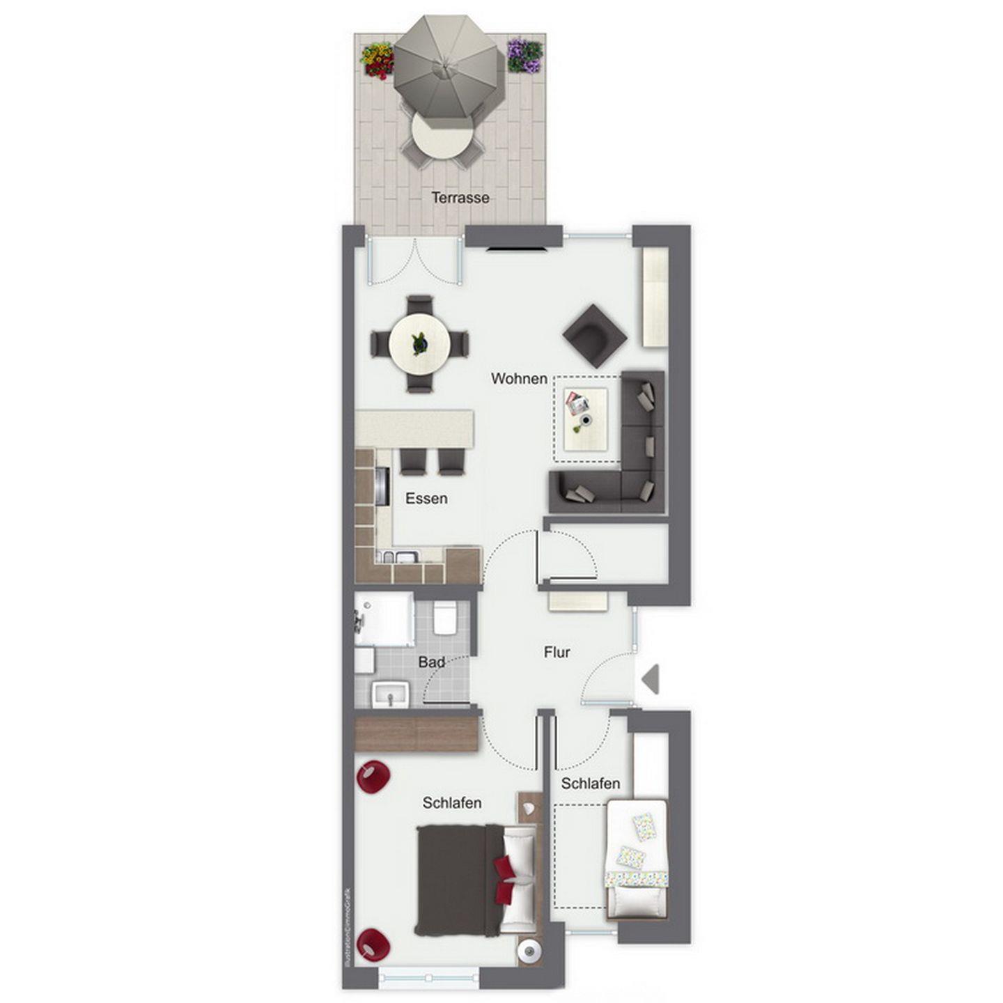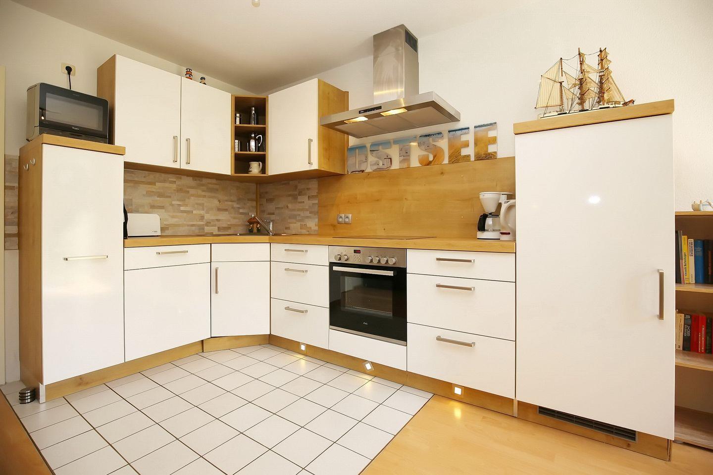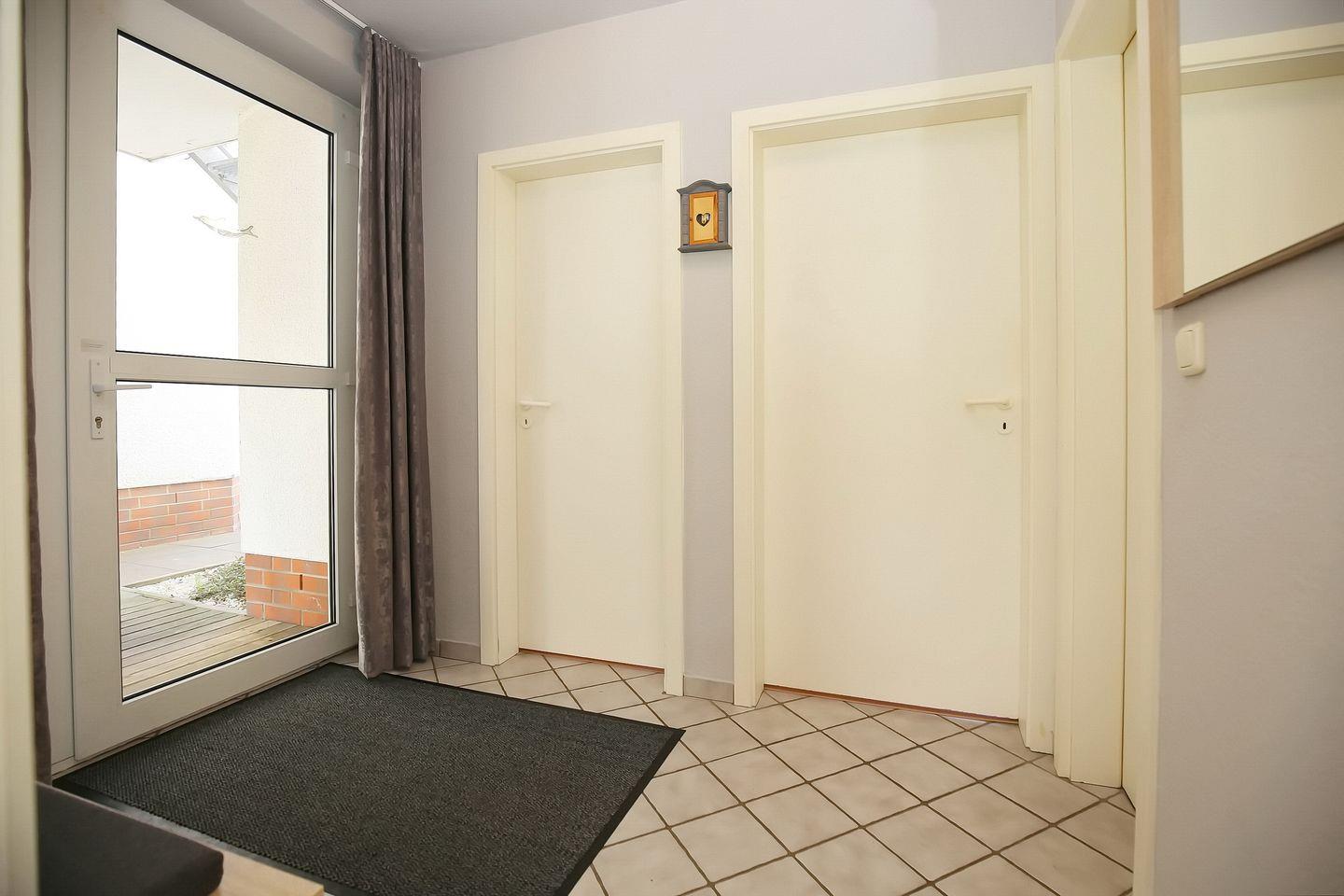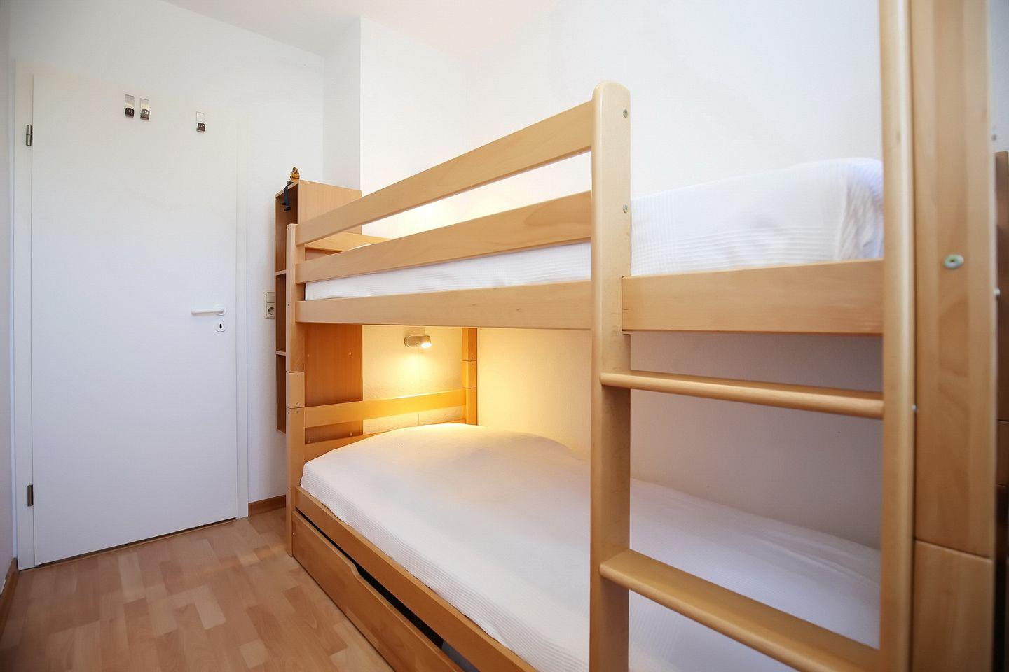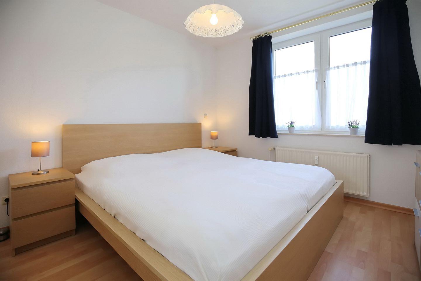 Die integrierte Küche bietet dir einen Kühlschrank mit Gefrierfach, einen Backofen, ein 4-Platten-Ceranfeld, eine Mikrowelle sowie einen Geschirrspüler. Das Schlafzimmer ist mit einem Doppelbett (2 x 90 x 200 cm) und einem 3-türigem Kleiderschrank eingerichtet. Das zweite Schlafzimmer verfügt über ein Etagenbett. Die Fenster haben Vorhänge. In beiden Schlafzimmern ist der Bodenbelag Laminat.