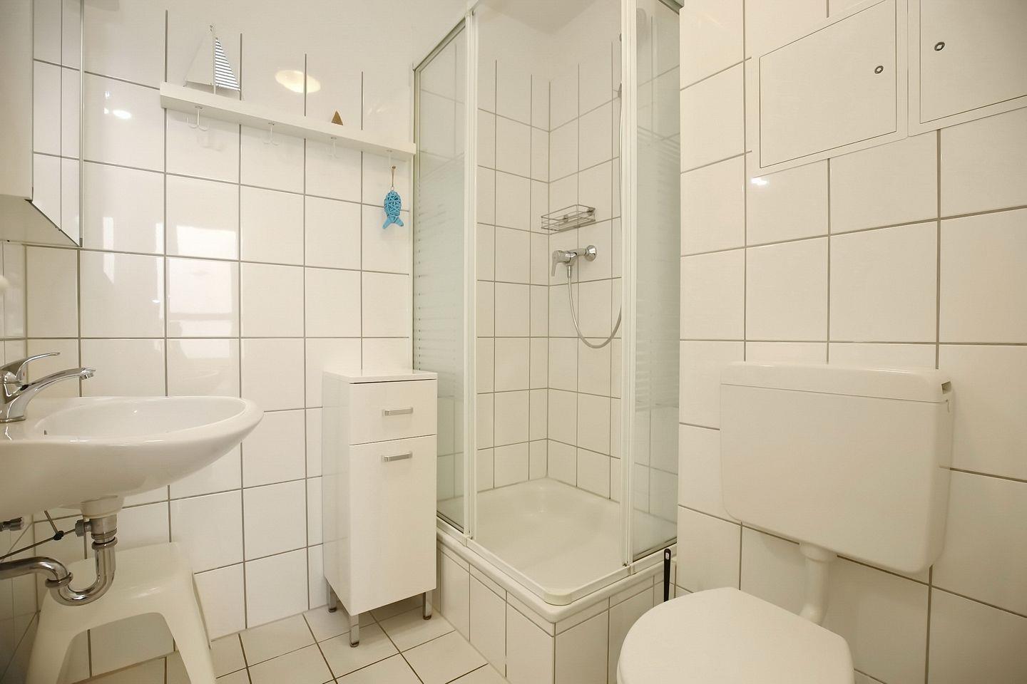 Das geflieste Duschbad ist mit Dusche und WC ausgestattet. Der Boden ist gefliest. In dieser Raucherwohnung sind maximal zwei Haustiere gestattet. Ein Bollerwagen (ohne Gewähr) sowie WLAN (ohne Gewähr) ist inklusive.