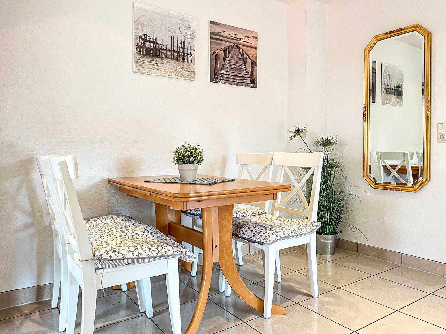 Im modern eingerichteten Wohnzimmer steht dir ein großer Flachbildfernseher für entspannte Fernsehabende zur Verfügung. Oder du relaxst einfach bei leiser Musik aus der Stereoanlage. Der Balkon in Richtung Westen ist mit Balkonmöbeln ausgestattet.