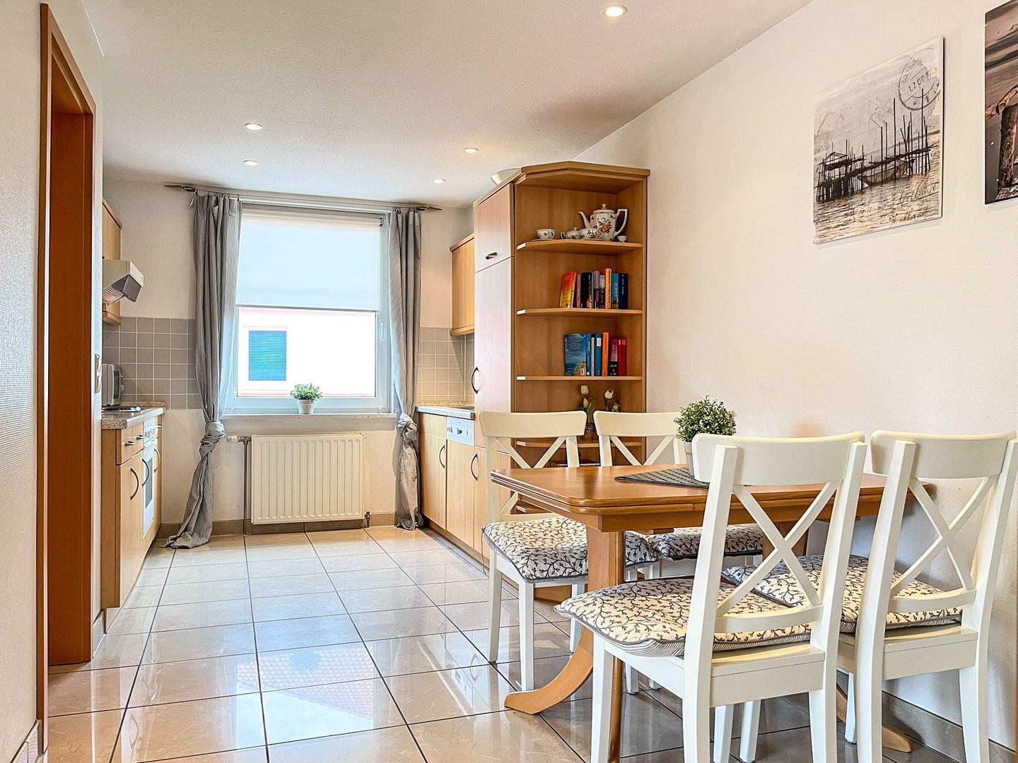 Die Ausstattung dieser Ferienwohnung lässt keine Wünsche offen. Die große, offene Küche ist selbstverständlich mit Geschirrspüler, 4-Plattenherd mit Backofen und Kühlschrank mit Gefrierfach ausgestattet. Im modernen Duschbad befindet sich zusätzlich eine Waschmaschine. Ein Gäste-WC ist auch vorhanden.