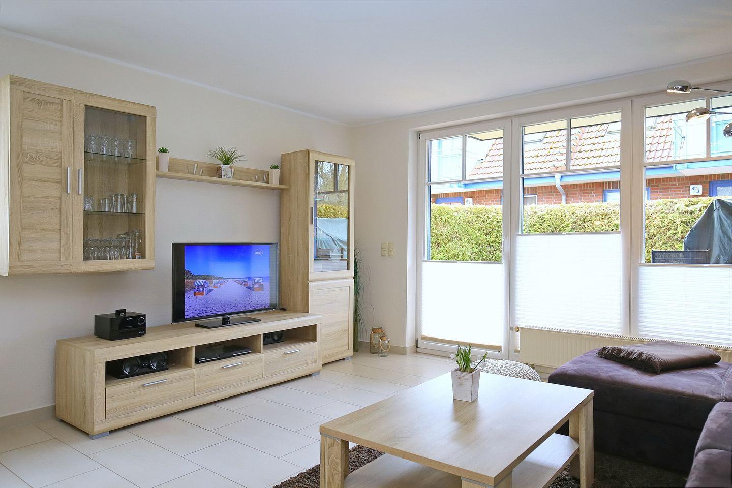 Vom Wohnzimmer mit seinen bodentiefen Fenstern erreichst du die modern möblierte Terrasse. Im hellen Wohn-/Essbereich mit seinen hochwertigen Fliesen kannst du auf der bequemen Polsterecke mit Schlaffunktion (130 x 190 cm) entspannen. Genieße deine Mahlzeiten am modernen und mit bequemen Polsterstühlen versehenen Esstisch. Für viel Unterhaltung sorgen der große Flachbild TV (40 Zoll, 102 cm), die moderne Musikanlage und der Blu-ray-Player. Eine kleine Auswahl an Kinderspielzeug lässt Kinderaugen strahlen.