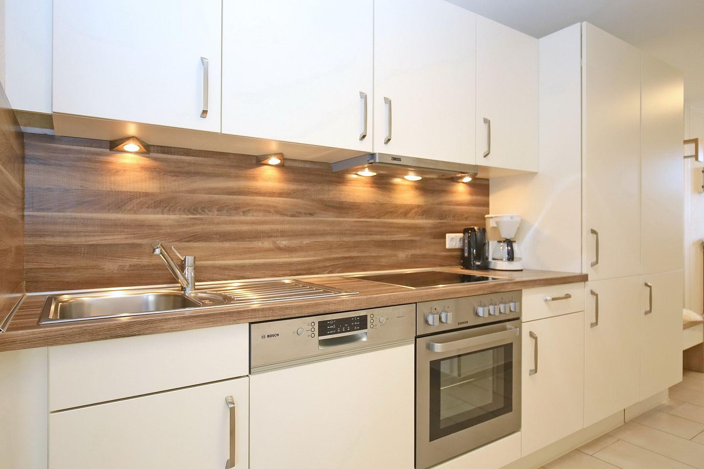 Die im offenen Stil gehaltene Küchenzeile bietet mit ihrer hochwertigen Ausstattung viel Raum für die Zubereitung der Mahlzeiten. Hier stehen ein Geschirrspüler, ein Cerankochfeld, ein Backofen und ein Kühlschrank mit Gefrierfach zur Verfügung.