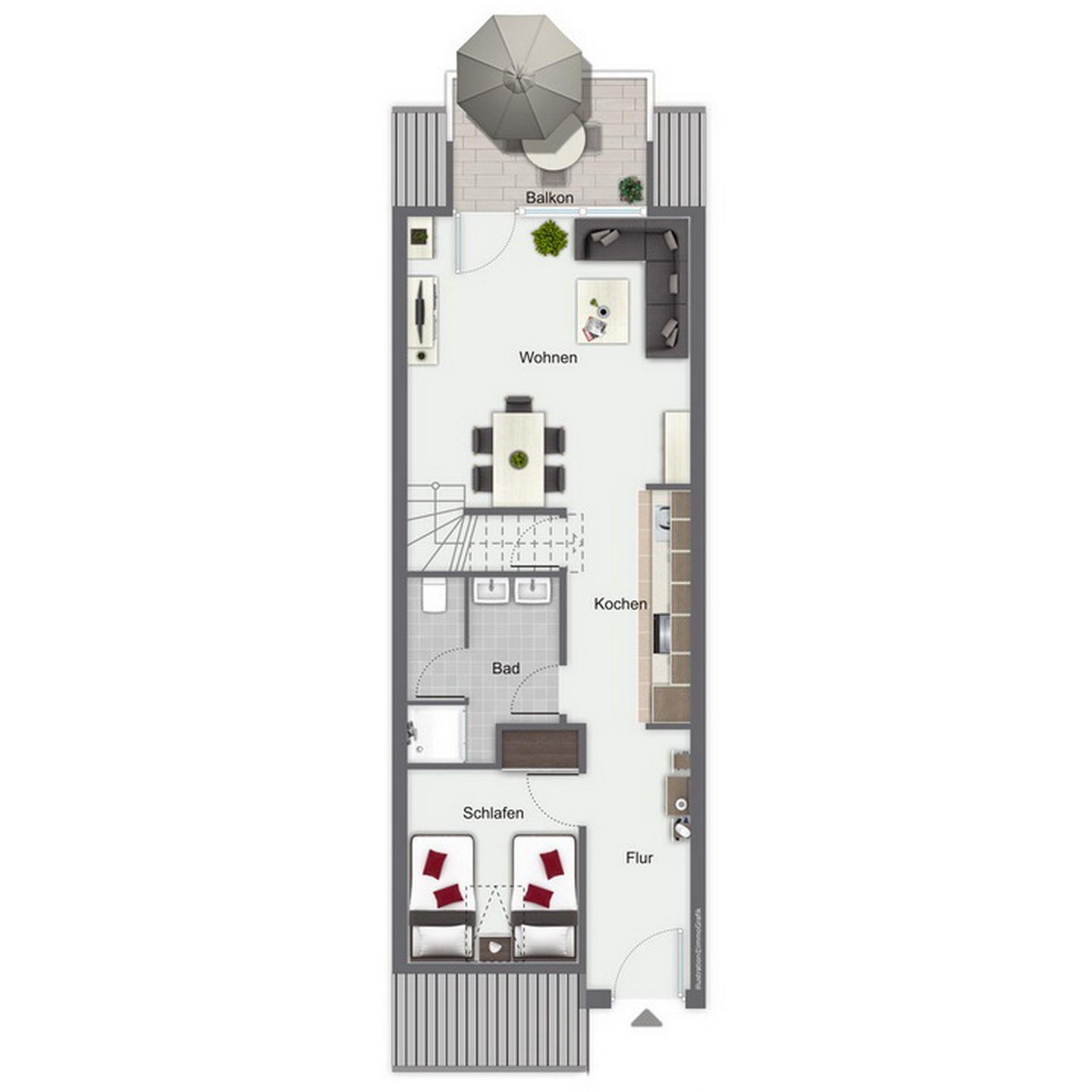 Auf zwei Etagen findest du hier eine moderne 4-Zimmer-Ferienwohnung im 1. OG mit Balkon in Süd-West-Lage vor. Die Wohnung mit einem eigenen Zugang über die Außentreppe bietet mit ca. 70 m² bis zu sechs Personen eine geräumige Unterkunft. Die Wohnung teilt sich auf in einen Wohn-/Essbereich, drei Schlafräume und ein Duschbad mit separatem WC. Die Entfernung zum Strand beträgt nur 250 m.