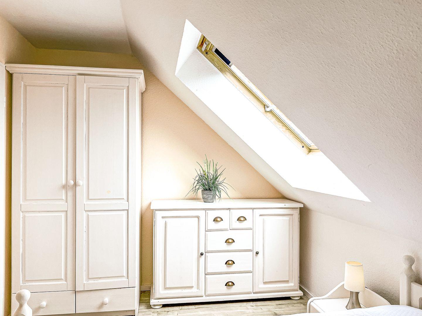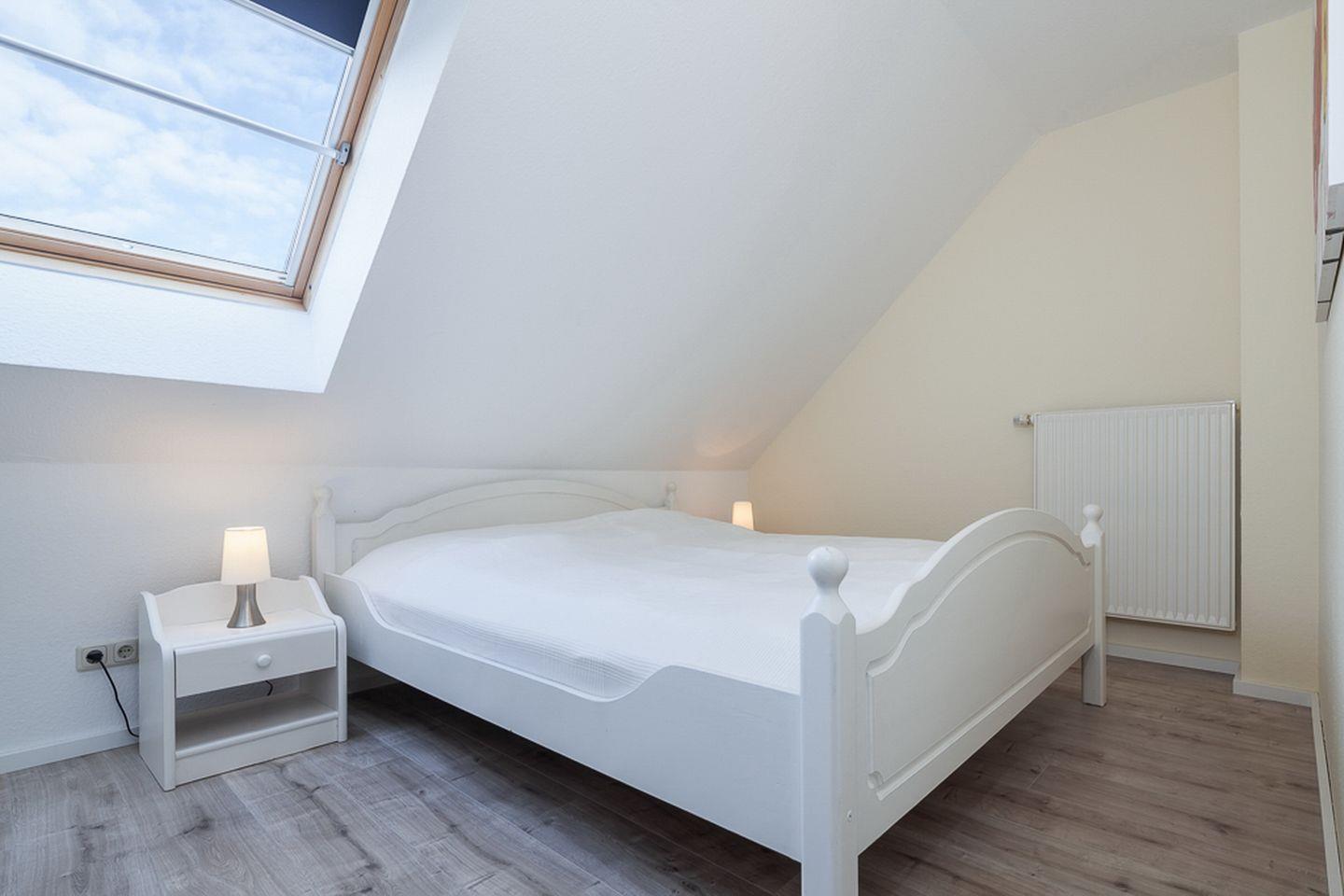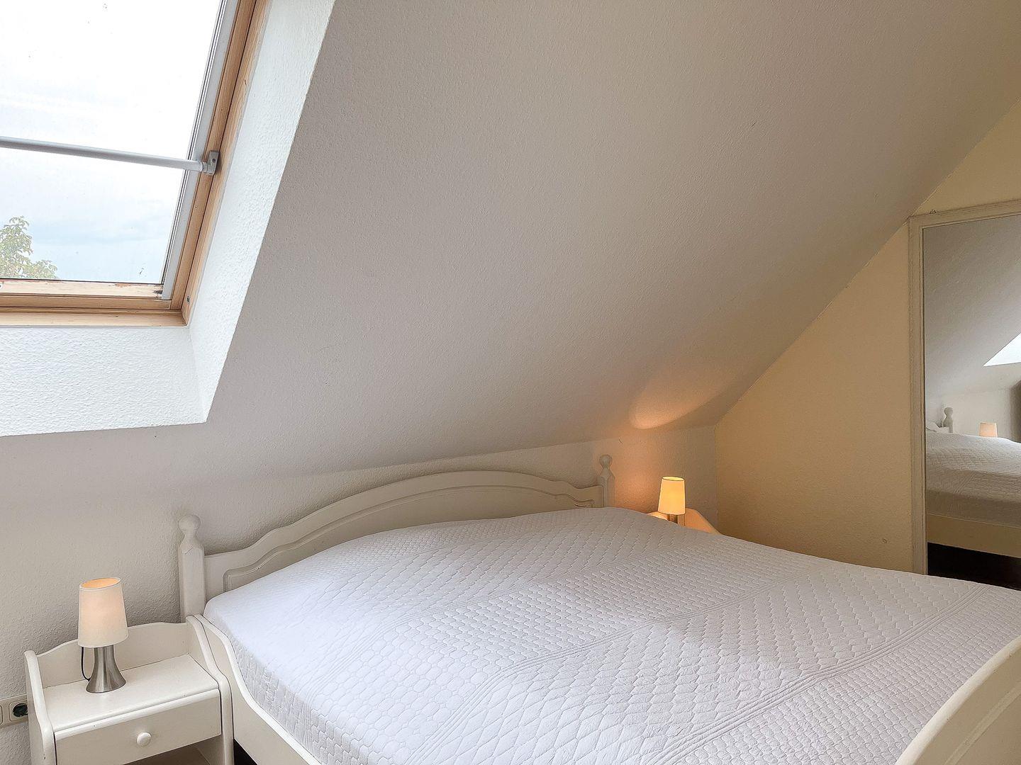 Das Schlafzimmer des 1. OG ist mit zwei Einzelbetten (90 x 200 cm) und einem Kleiderschrank möbliert. Die zwei Schlafzimmer im Dachgeschoss erreichst du vom Wohnbereich über eine innenliegende Treppe. Beide Schlafräume sind mit jeweils einem Doppelbett (2 x 90 x 200 cm und 2 x 80 x 200 cm) und einem Kleiderschrank eingerichtet. Hier steht dir ein zweites TV-Gerät zur Verfügung. An den Fenstern sind Rollos bzw. Außenjalousien zur Verdunkelung angebracht.