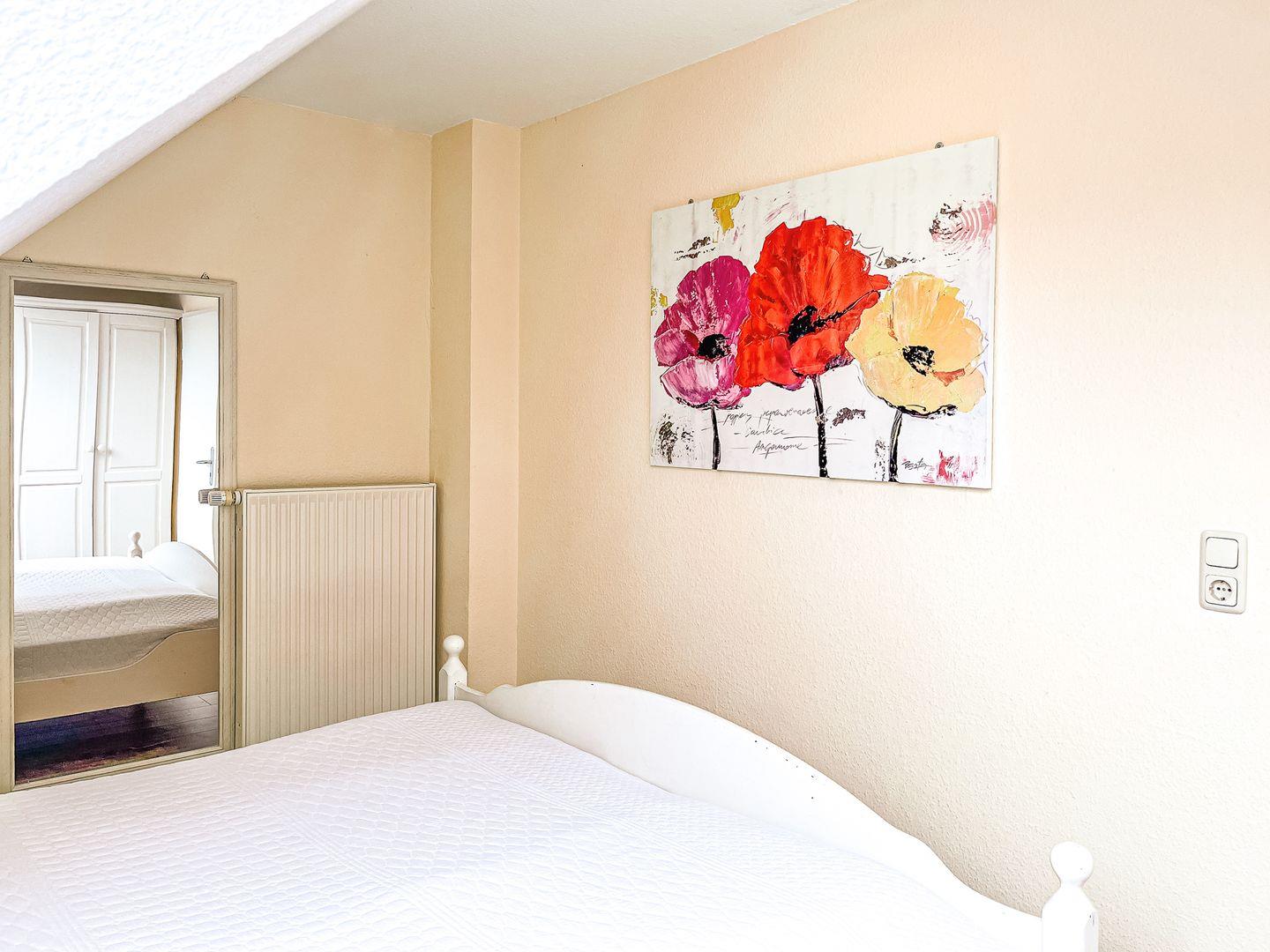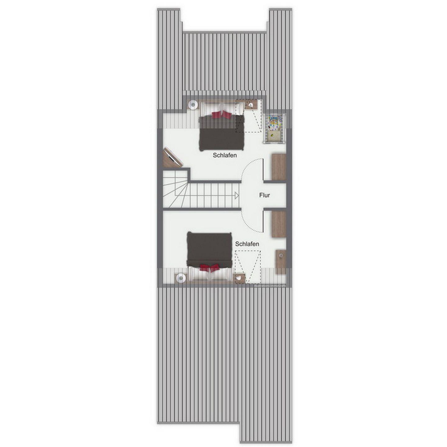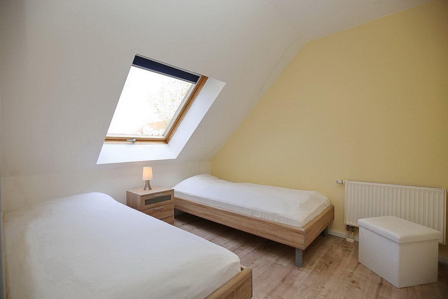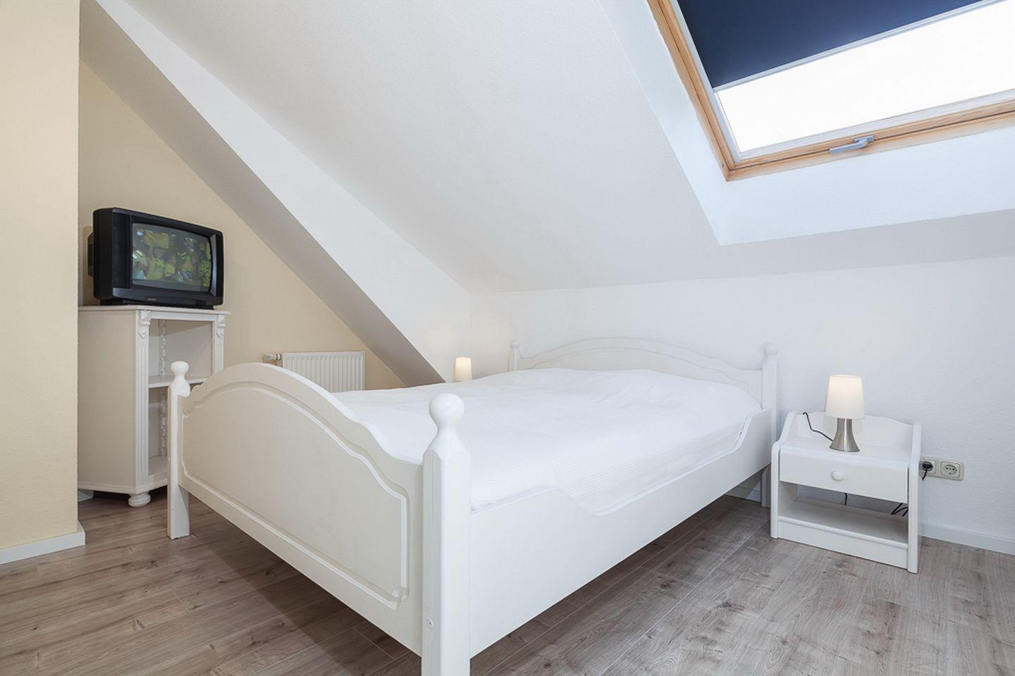 Das Schlafzimmer des 1. OG ist mit zwei Einzelbetten (90 x 200 cm) und einem Kleiderschrank möbliert. Die zwei Schlafzimmer im Dachgeschoss erreichst du vom Wohnbereich über eine innenliegende Treppe. Beide Schlafräume sind mit jeweils einem Doppelbett (2 x 90 x 200 cm und 2 x 80 x 200 cm) und einem Kleiderschrank eingerichtet. Hier steht dir ein zweites TV-Gerät zur Verfügung. An den Fenstern sind Rollos bzw. Außenjalousien zur Verdunkelung angebracht.