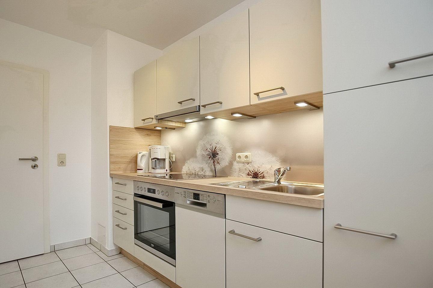 In der separaten Küche findest du alles für die Zubereitung deiner Mahlzeiten. Dazu gehören auch ein Geschirrspüler, ein 4-Plattenkochfeld mit Backofen, eine Mikrowelle und ein Kühlschrank mit Gefrierfach.