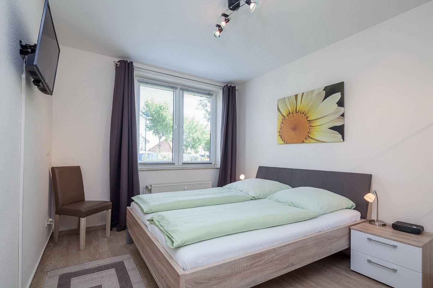 Im Schlafzimmer befindet sich ein großer Kleiderschrank für deine Urlaubsgarderobe. Der zweite Flachbild-TV an der Wand ermöglicht bequemes Fernsehen vom Doppelbett (2 x 80 x 200 cm) aus. Ein Vorhang am Fenster sorgt für erholsamen Schlaf. Der Boden ist im Wohn- und Schlafbereich mit Laminat ausgelegt.