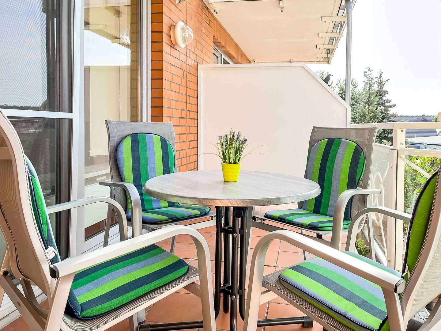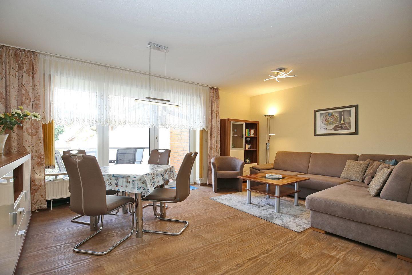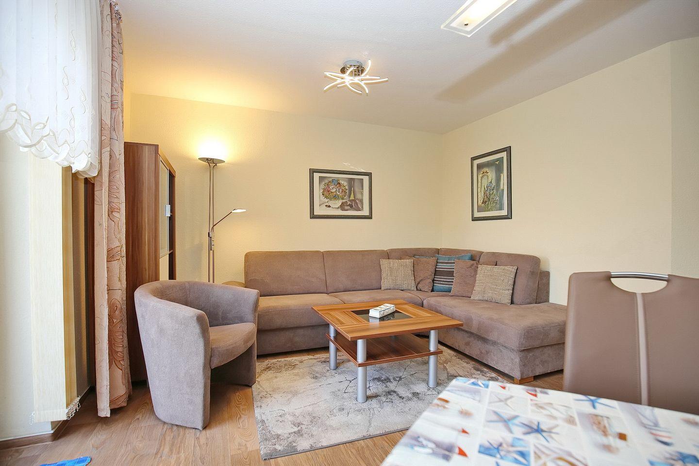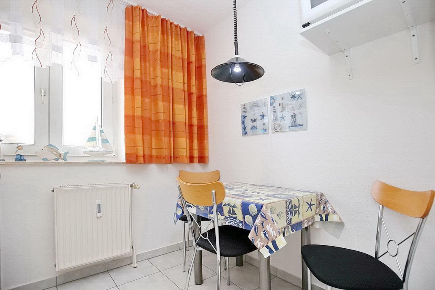 Das Wohnzimmer ist hell und modern eingerichtet. Auf der gemütlichen Couch kannst du abends herrlich zusammensitzen und den schönen Strandtag Revue passieren lassen. Dir stehen ein Flachbild-TV, ein DVD-Player und eine Stereoanlage zur Verfügung. Zusätzlich lassen zahlreiche Bücher keine Langeweile aufkommen. Die Couch (140 x 190 cm) kann durch Ausklappen in einen Komfortschlafplatz für zwei Personen verwandelt werden. Der moderne Esstisch am hellen Balkonfenster bietet den idealen Platz für gemeinsame Mahlzeiten.