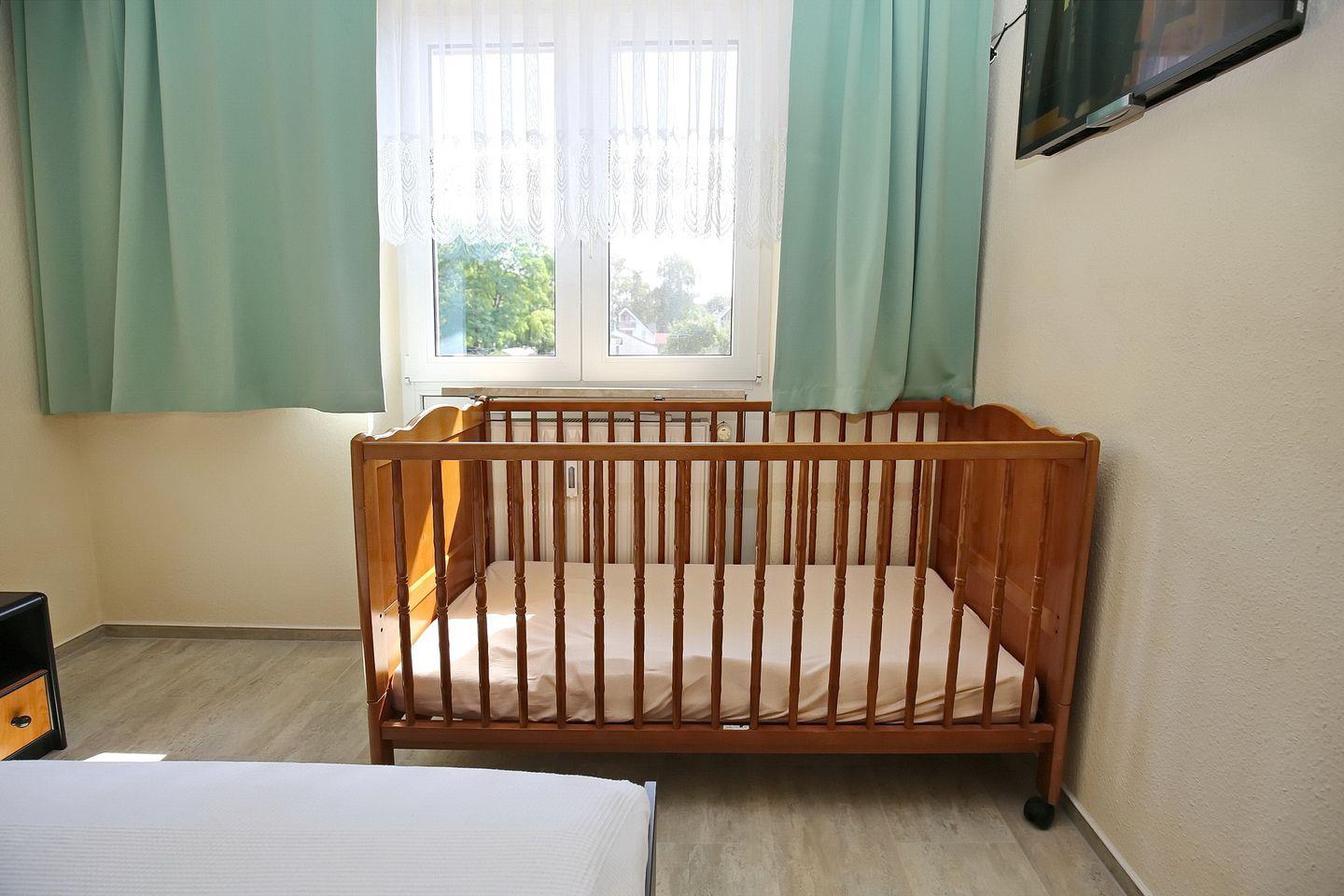 Das Schlafzimmer verfügt über ein großes Doppelbett (2 x 90 x 200 cm) und einen Kleiderschrank mit viel Stauraum für deine Urlaubsgarderobe. Hier befindet sich zusätzlich ein 2. Flatscreen-TV. Ein Hochstuhl sowie ein Kinderbett stehen für deine kleinen Gäste ebenfalls zur Verfügung.