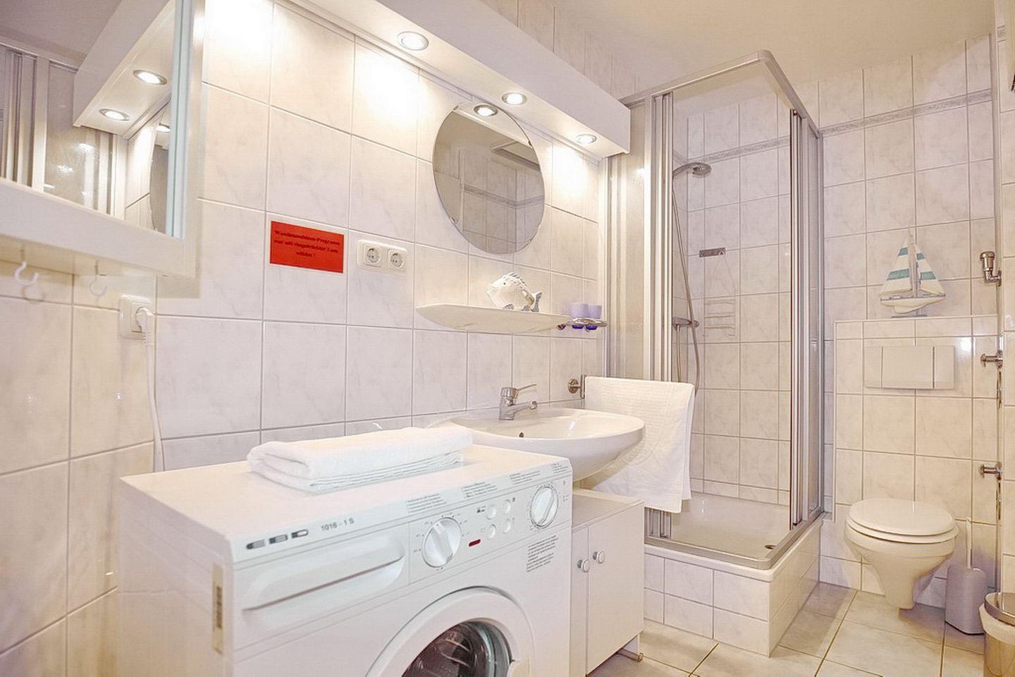 Vervollständigt wird die Ferienwohnung durch ein funktionelles Duschbad, in dem auch die Waschmaschine untergebracht ist.