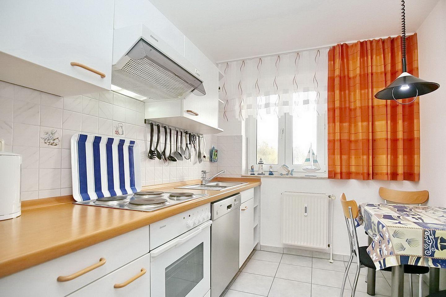 Die Küche ist separat gelegen und mit einem Kühlschrank mit Gefrierfach, Geschirrspüler, 4-Plattenherd mit Backofen und Mikrowelle gut ausgestattet. Eine kleine Essecke in der Küche lädt zum Frühstücken ein.