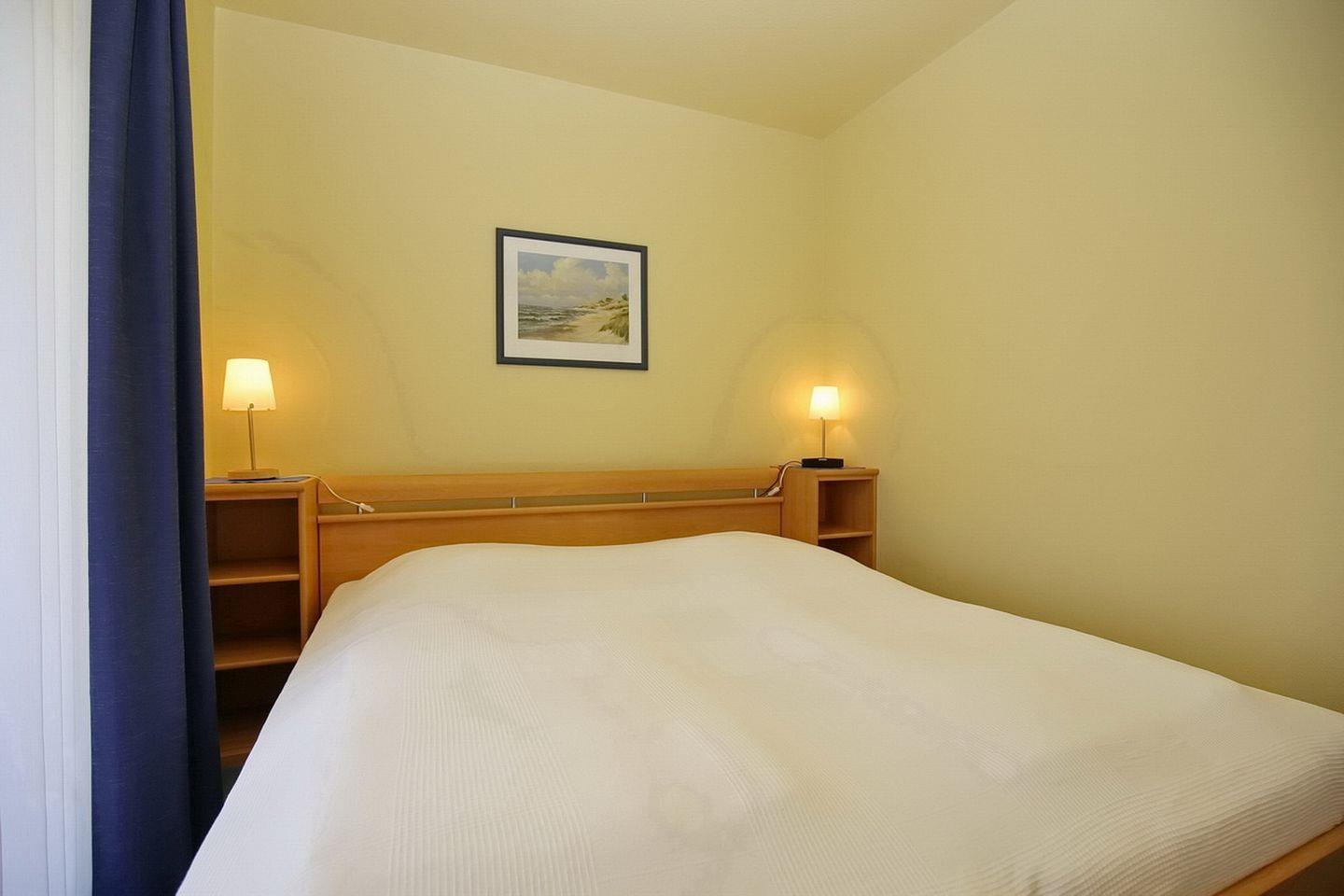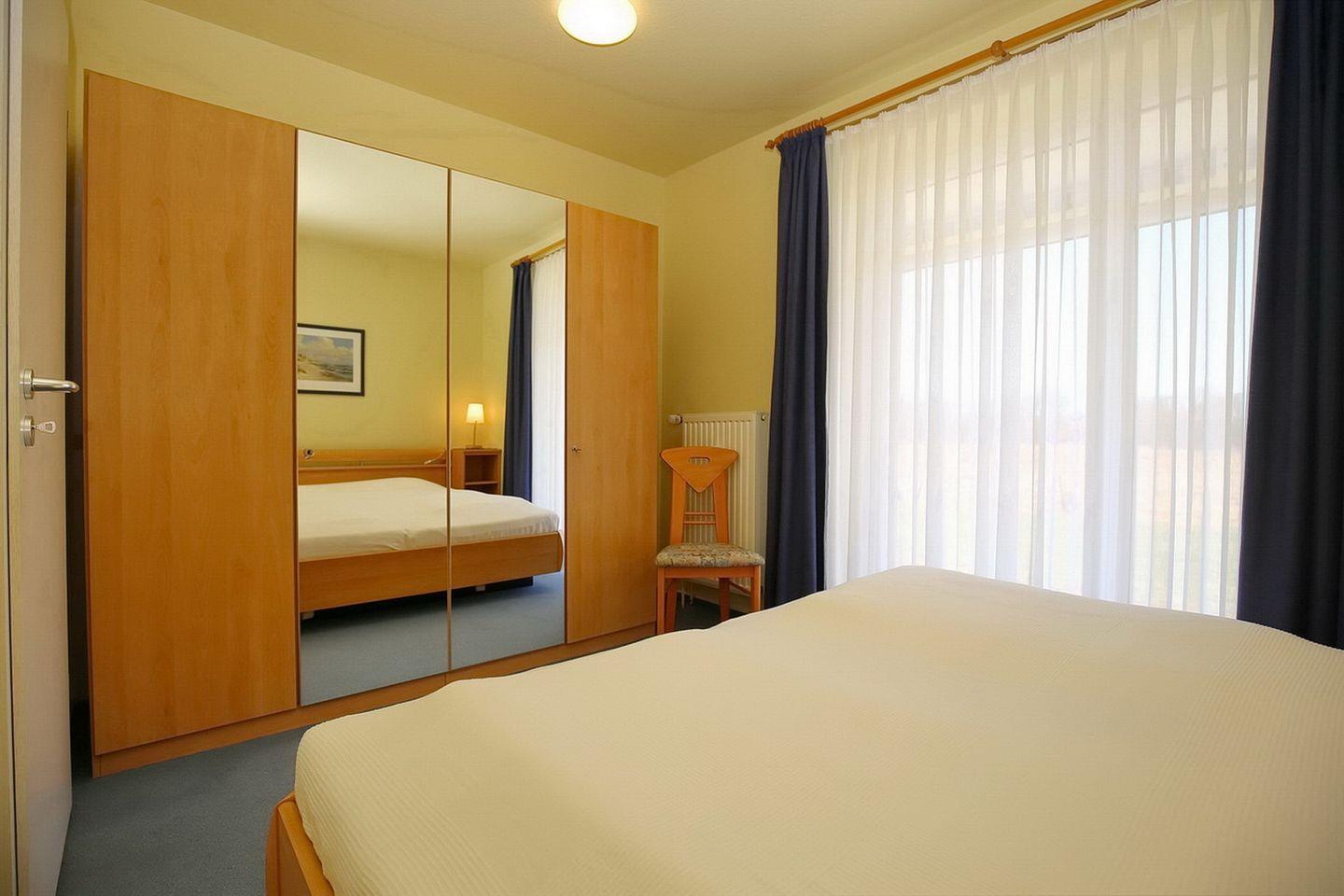 Das Schlafzimmer verfügt über ein großes Doppelbett (2 x 90 x 200 cm) und einen Kleiderschrank mit viel Stauraum für deine Urlaubsgarderobe. Das Schlafzimmer ist mit Teppich ausgelegt. An den Fenstern befinden sich Vorhänge.
