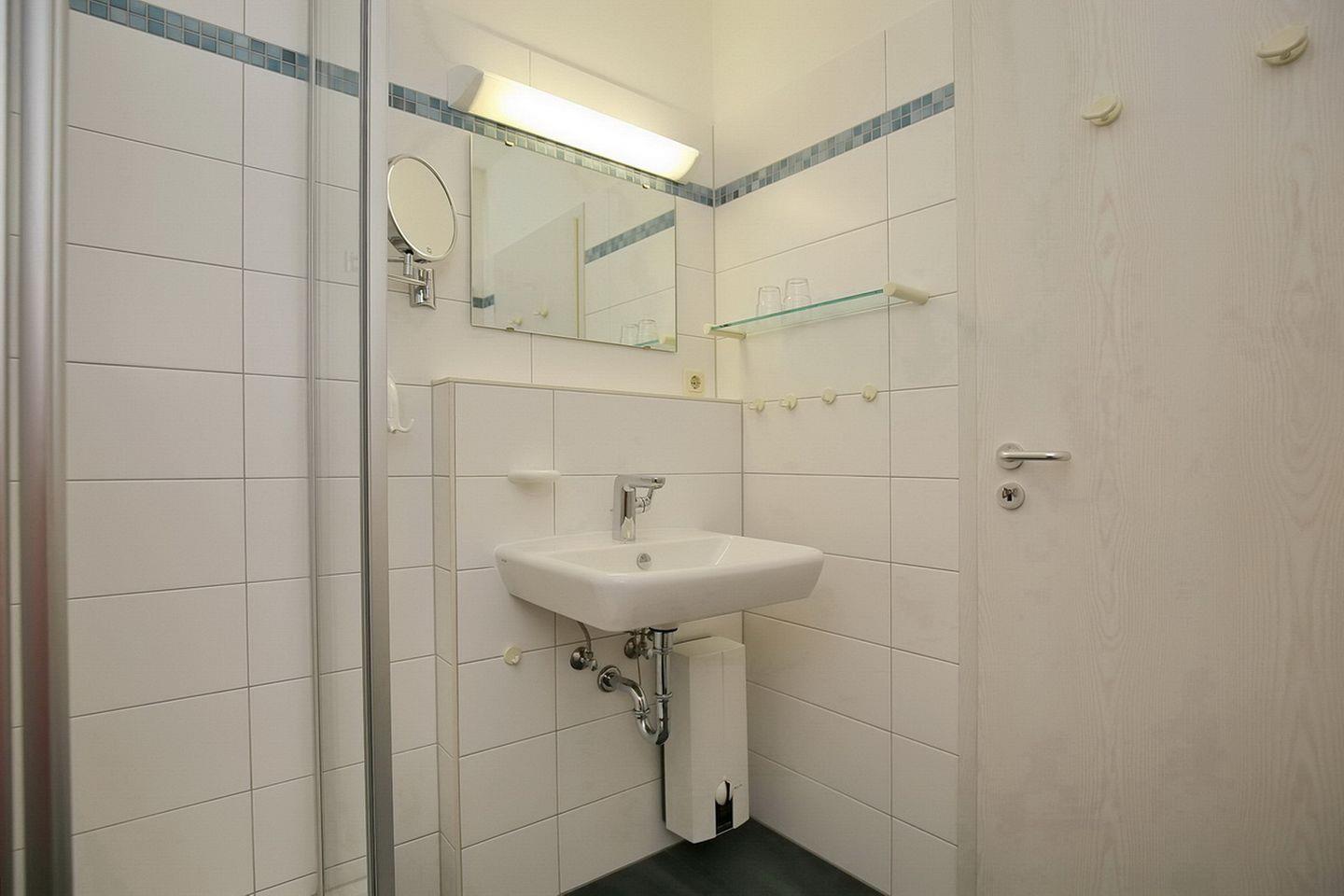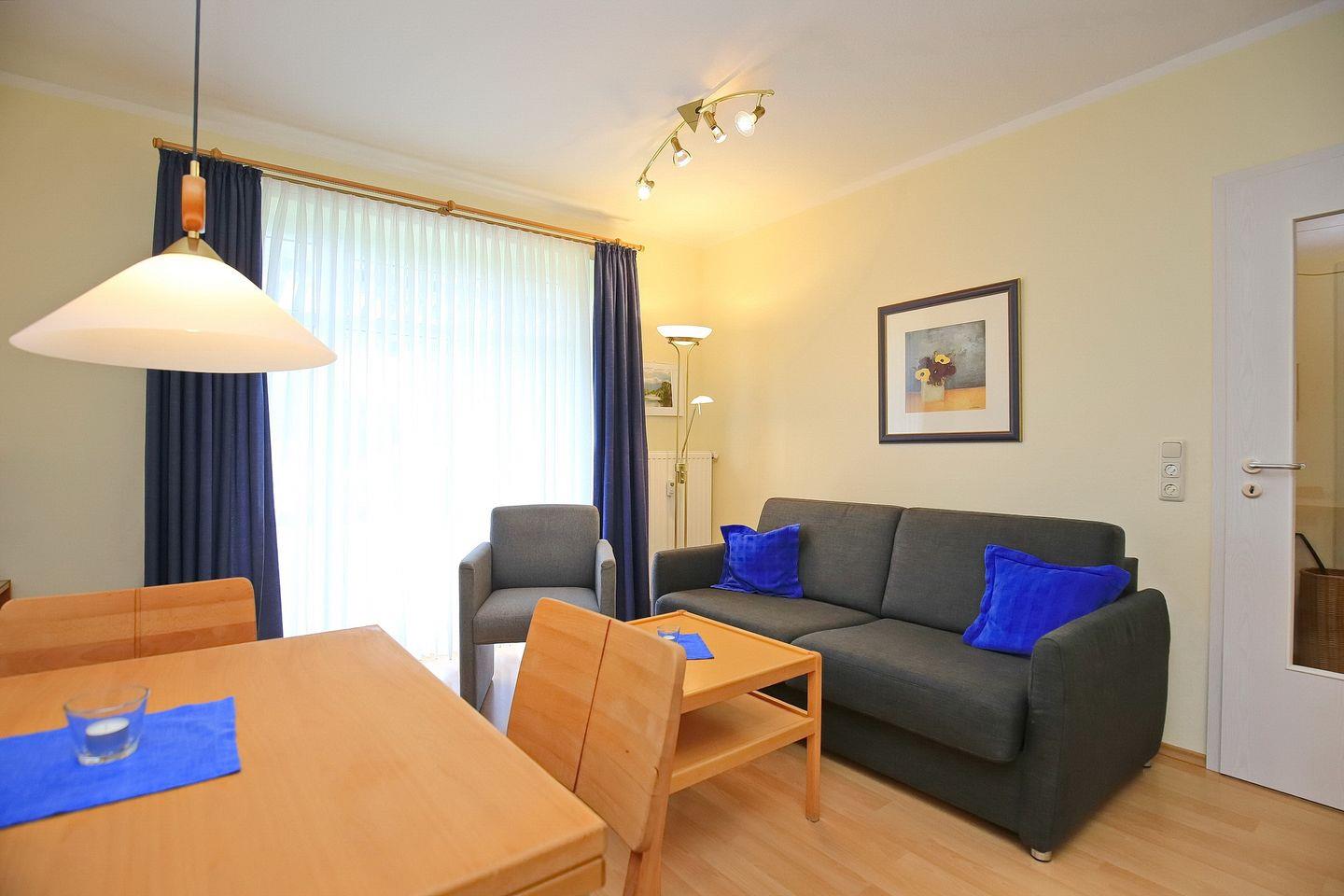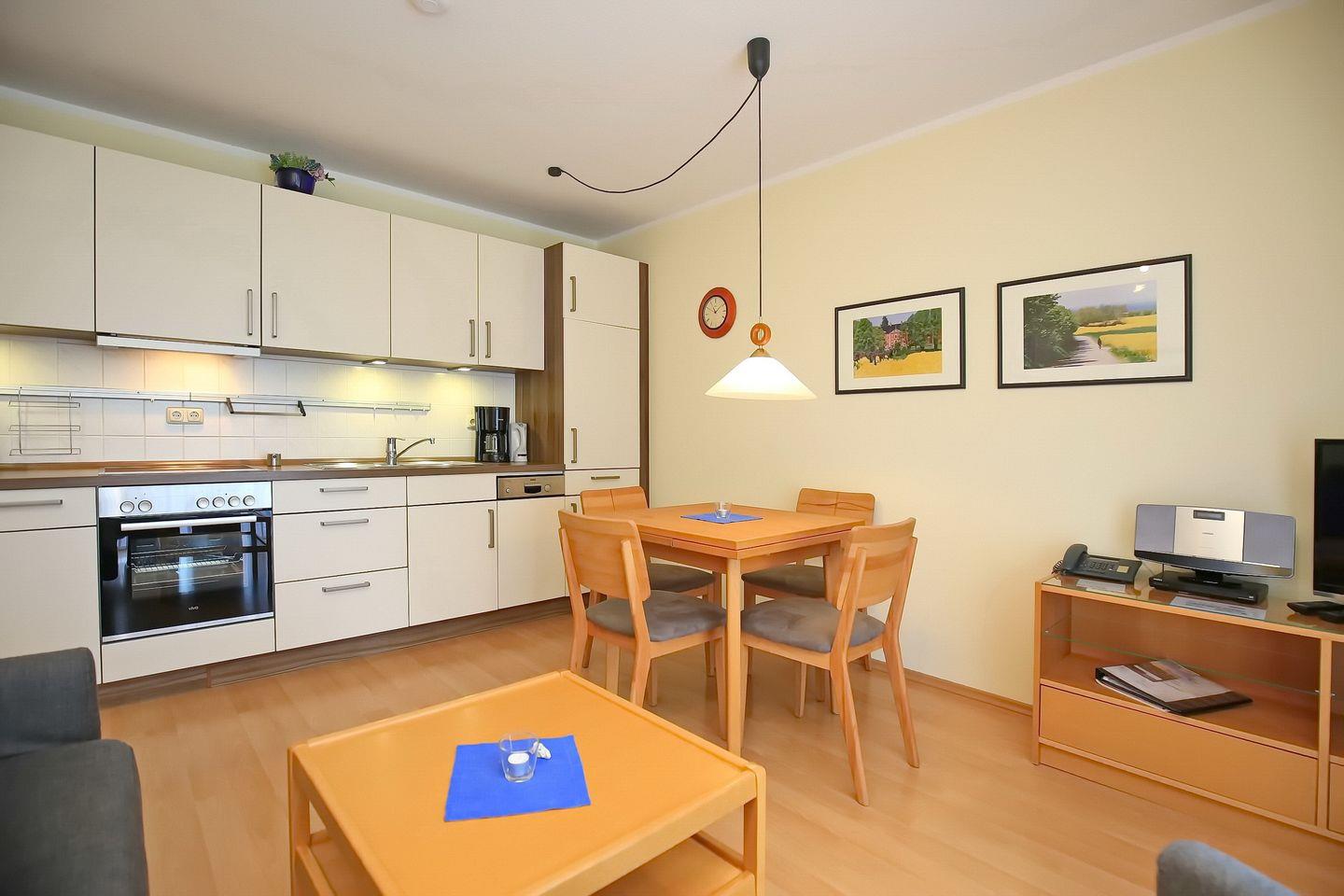 Die 44 m² große Erdgeschoss-Ferienwohnung verfügt über ein Wohnzimmer mit Küchenzeile, ein Schlafzimmer und ein Duschbad. Zum Strand sind es nur ca. 100 m.