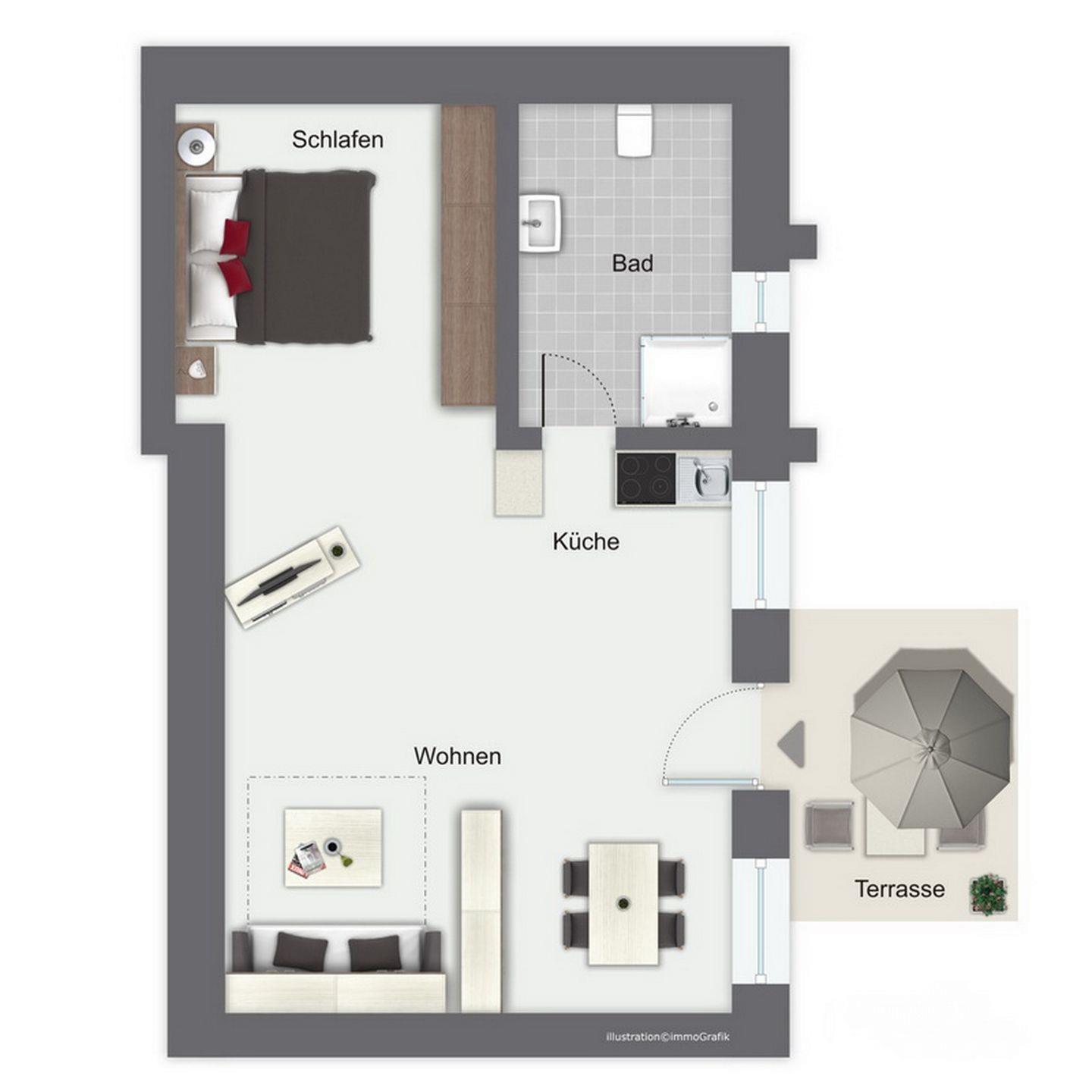 Im Wohnbereich befinden sich eine Schlafcouch (160 x 200 cm), ein Flachbildfernseher, ein CD-Player und eine Stereoanlage. In einer kleinen Nische befindet sich der Schlafbereich mit Doppelbett (2 x 80 x 200 cm) und ein geräumiger Kleiderschrank für deine Urlaubsgarderobe. Eine kleine, möblierte Terrasse lädt zum Relaxen ein.