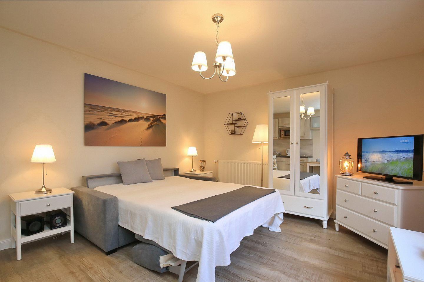 In deinem Wohn-/Schlafraum befindet sich als Schlafmöglichkeit eine Doppelschlafcouch (160 cm x 200 cm). Ein Flachbildfernseher mit SAT-TV und Hifi-Anlage mit CD helfen, an regnerischen Tagen die Zeit nicht zu lang werden zu lassen. Ein Duschbad/WC ist selbstverständlich vorhanden. In der gesamten Wohnung wurde Designbelag verlegt.