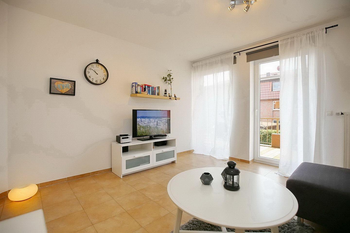 In dieser sonnigen Ferienwohnung findest du ein Wohnzimmer mit Zugang zum Balkon, ein Schlafzimmer, die Küche und ein Duschbad vor.