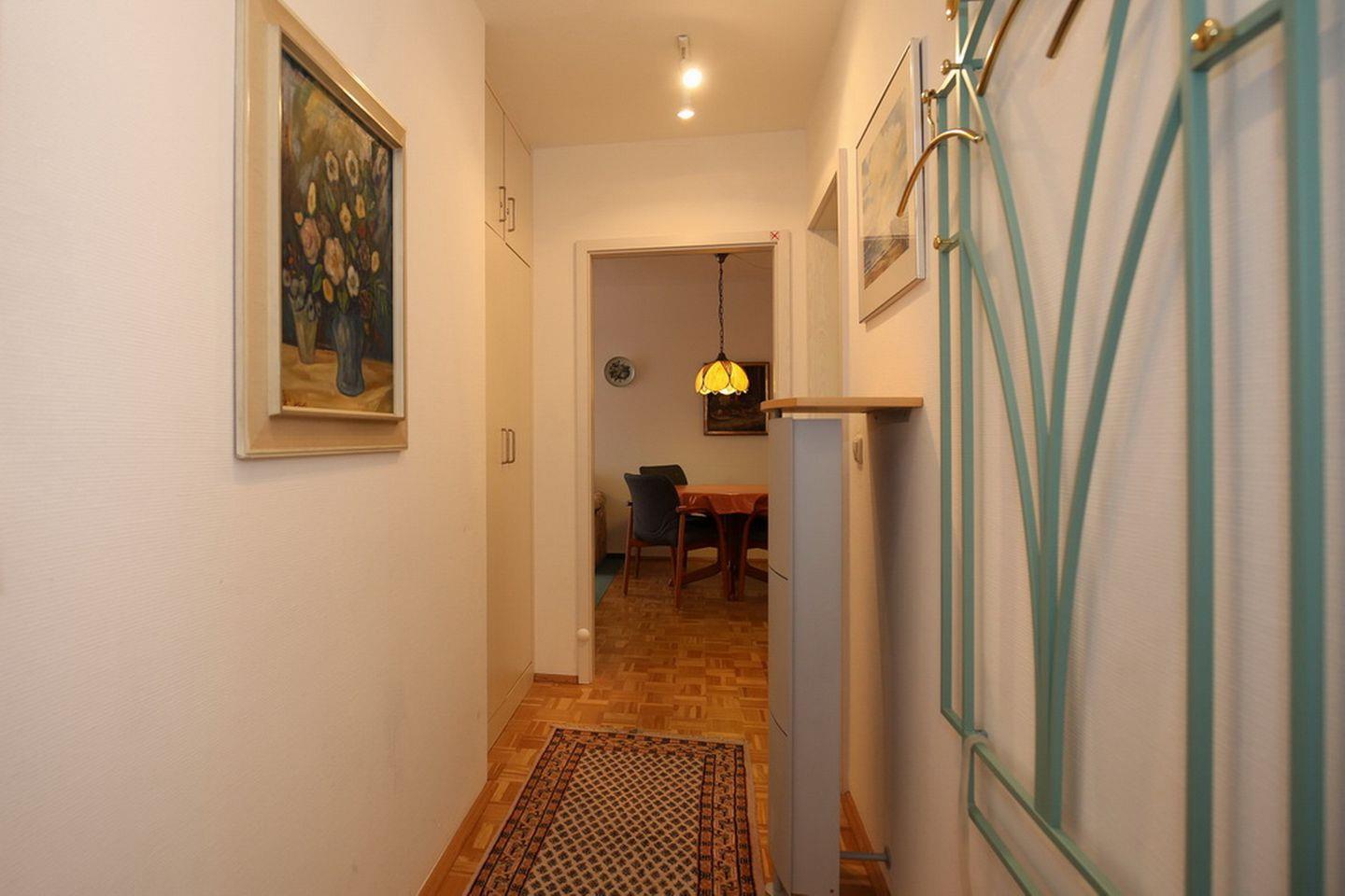 Die Küchenzeile liegt im Wohnbereich und ist mit einem Kühlschrank mit Gefrierfach, Geschirrspüler, Herd mit Backofen, 4-Plattenkochfeld und Mikrowelle gut ausgestattet. Der Esstisch im Küchenbereich bietet den idealen Platz für gemeinsame Mahlzeiten. Der Bodenbelag im Küchenbereich ist Parkett.