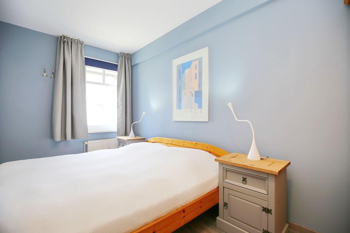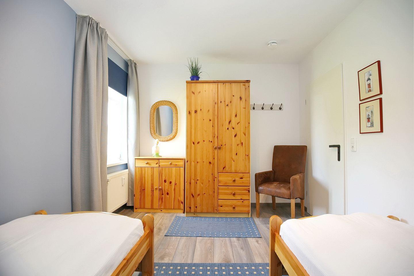 Beide Schlafzimmer in dieser Ferienwohnung verfügen über ein Doppelbett (2x 90 x 200 cm), 2 Einzelbetten (90 x 200 cm) und einen Kleiderschrank. Vorhänge und Rollos dienen in beiden Schlafzimmern als Sicht- bzw. Sonnenschutz.