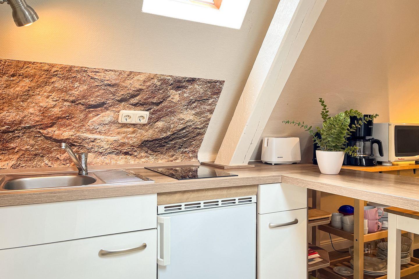 Die Ferienwohnung Nr. 7 verfügt über einen Wohn-/Schlafraum mit Pantryküche und ein Badezimmer. Hier verbringst du kuschelige Tage zu zweit. Vom kleinen Dachfenster aus kannst du schon beim Frühstück den Blick auf die Ostsee genießen. Die Strandentfernung beträgt nur 10 Meter.