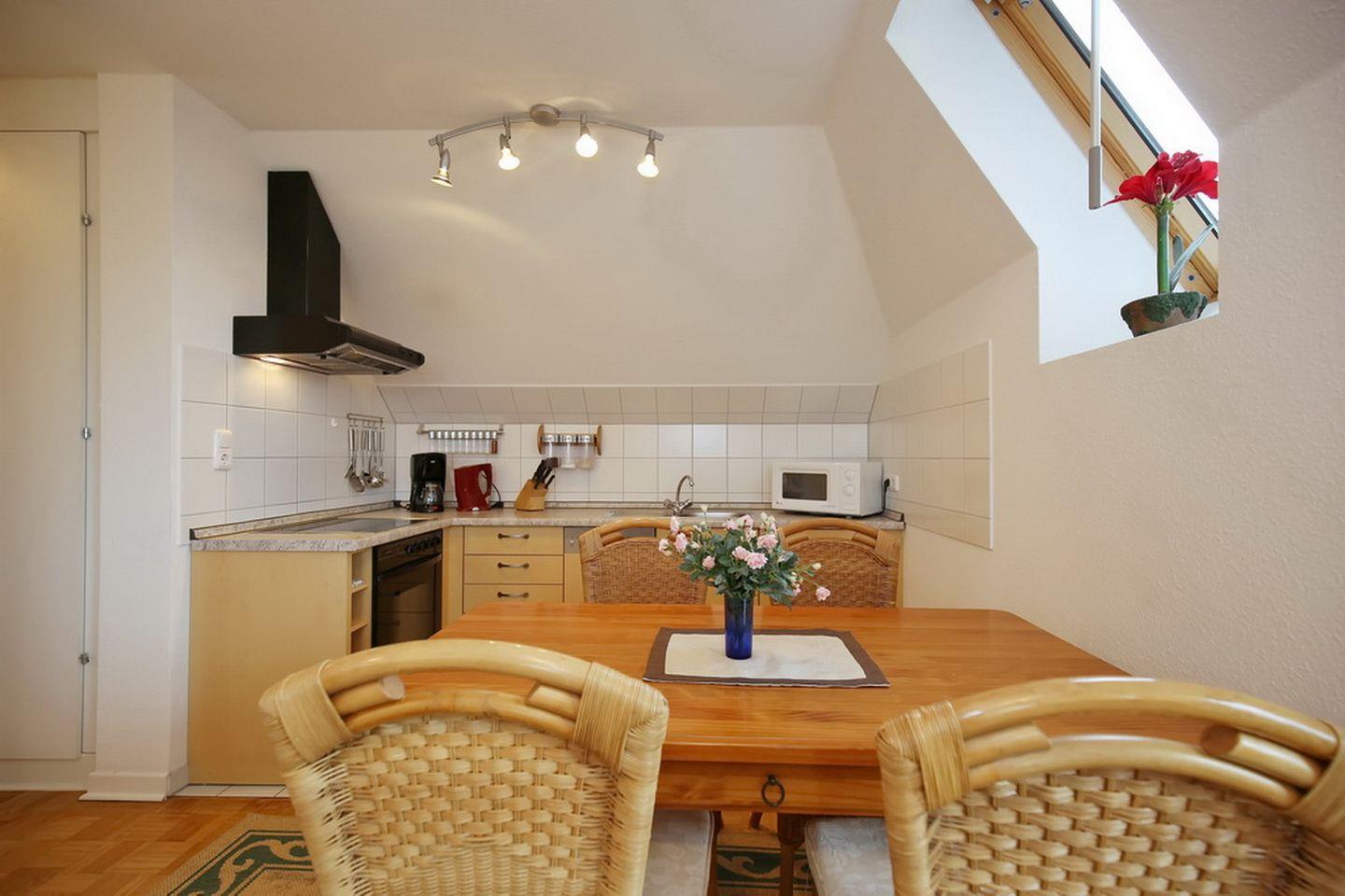 Die Küchenzeile ist mit Kühlschrank mit Gefrierfach, Geschirrspüler, Backofen, 4-Platten-Cerankochfeld und Mikrowelle vollständig eingerichtet. Am Essplatz, gleich neben der Küchenzeile, hast du mit 4 Korbstühlen am Tisch viel Platz für deine Urlaubsmahlzeiten.