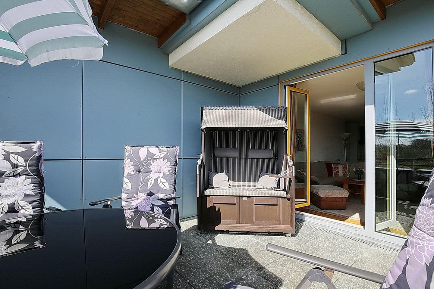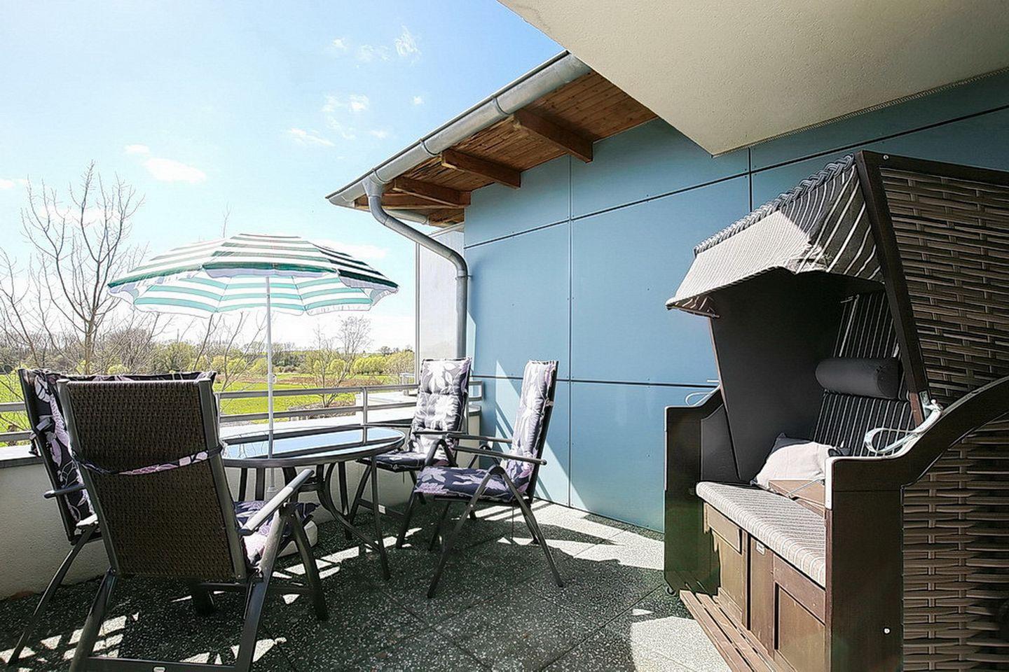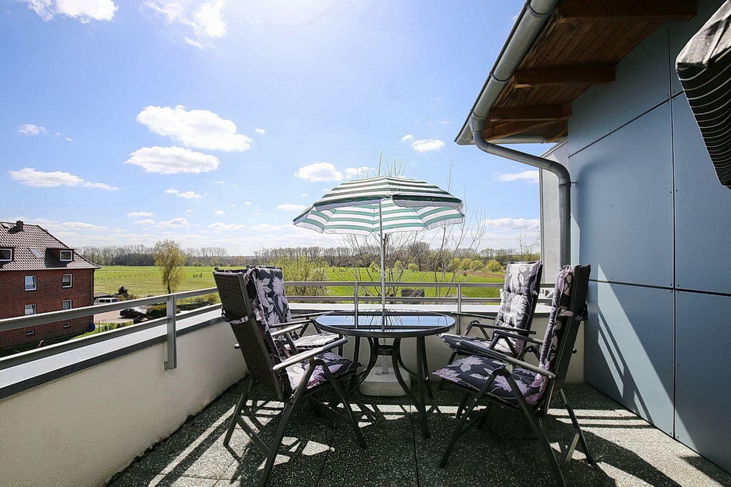 Du betrittst den möblierten Balkon der Ferienwohnung vom Wohnzimmer aus. Hier im Wohnbereich sorgt die gute Ausstattung mit bequemer Couchgarnitur, Flachbild-TV und Radio für Urlaubskomfort.
