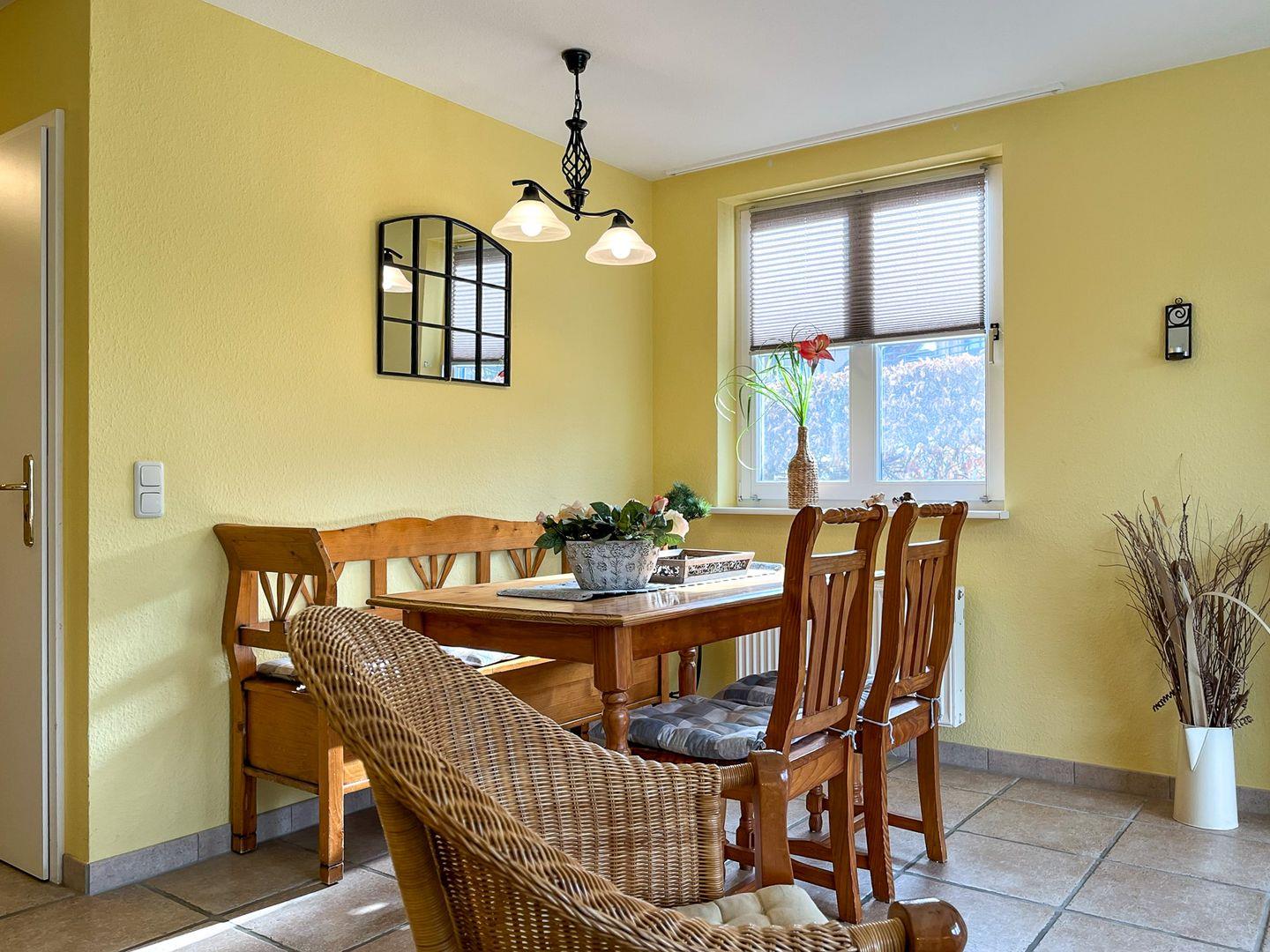Auch der Essbereich mit gemütlicher Truhenbank befindet sich im Wohnbereich. Die Küchenzeile ist voll ausgestattet mit einem Geschirrspüler, einem Backofen, einem 4-Platten-Cerankochfeld und natürlich einem Kühlschrank mit Gefrierfach.