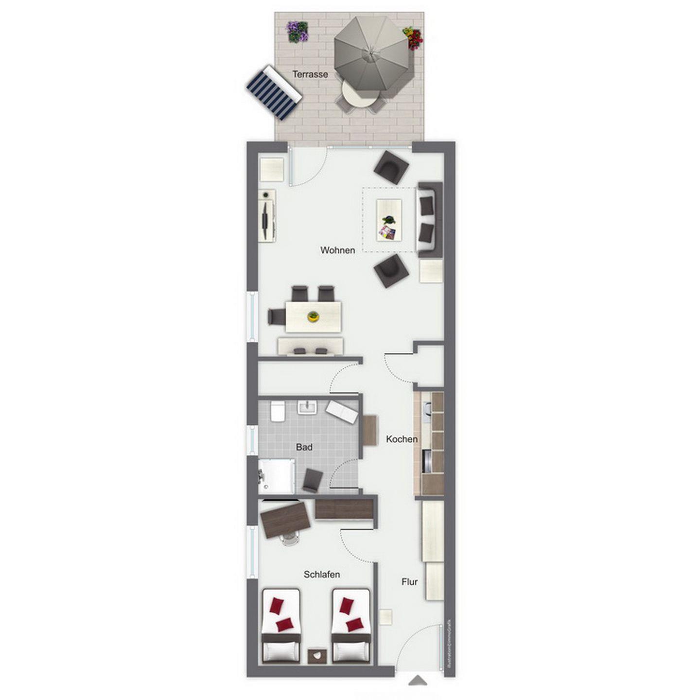 Unsere lichtdurchflutete Außenwohnung mit einer Terrasse in Süd-West-Lage befindet sich im Erdgeschoss im Haus 1. Auf ca. 55 m² bieten wir dir eine im mediterranen Stil eingerichtete Ferienwohnung mit einem gemütlichen Wohn- und Essbereich, einem Schlafzimmer, einer Küchenzeile und einem Duschbad. Der Strand ist nur etwa 250 m vom Feriendorf Papillon entfernt.