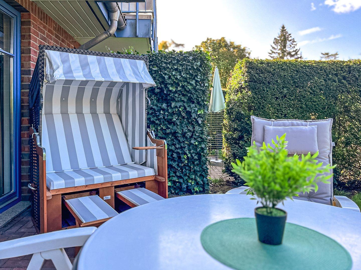Auf der mit einer Sitzgarnitur und einem neuen Strandkorb möblierten Terrasse genießt du ganztägig die Sonne mit freiem Blick ins Grüne. Ein bequemes Schlafsofa für die dritte Person ist vorhanden. Zur Unterhaltung stehen dir ein großer Flachbildschirm, DVD-Player, DVDs, eine Hi-Fi-Anlage mit Dockingstation (für USB) und ein CD-Player zur Verfügung.