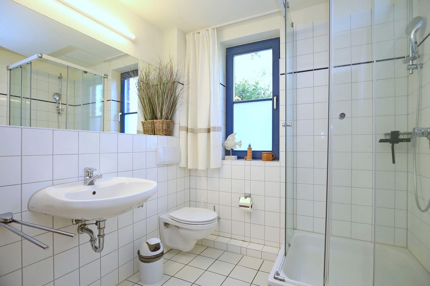 Das helle Duschbad mit Fenster ist gefliest. In dieser Nichtraucherwohnung sind Haustiere erlaubt.
