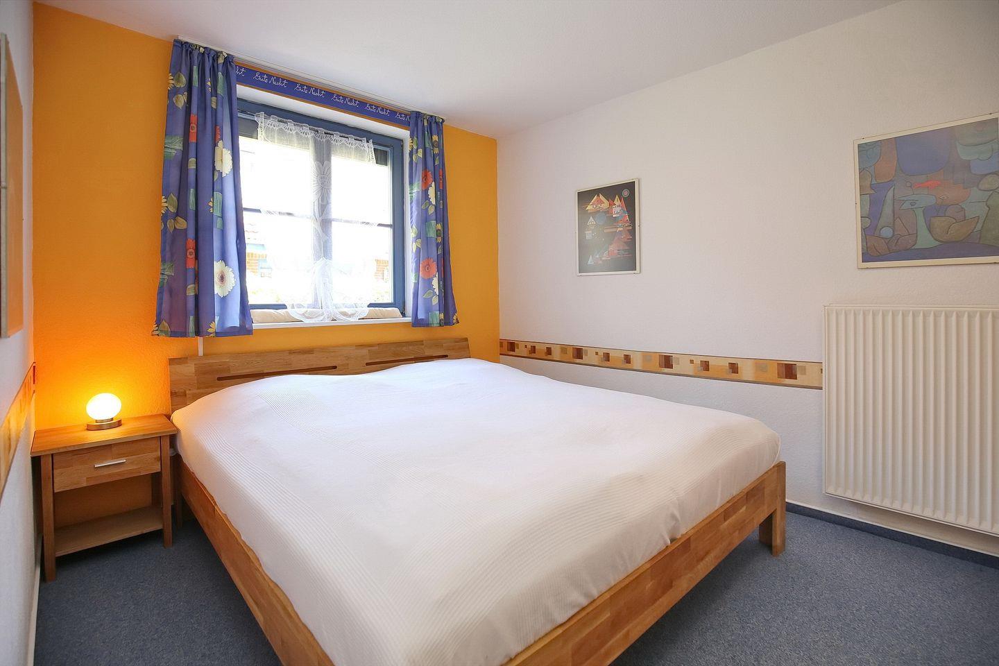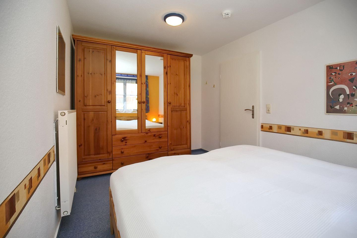Im Schlafzimmer steht ein Doppelbett (2 x 90 x 200 cm) und ein geräumiger Kleiderschrank zur Verfügung. Am Fenster befinden sich Vorhänge und ein Rollo.