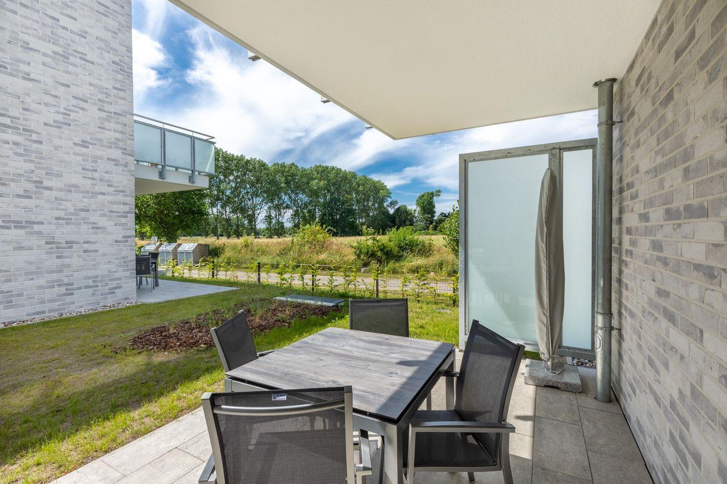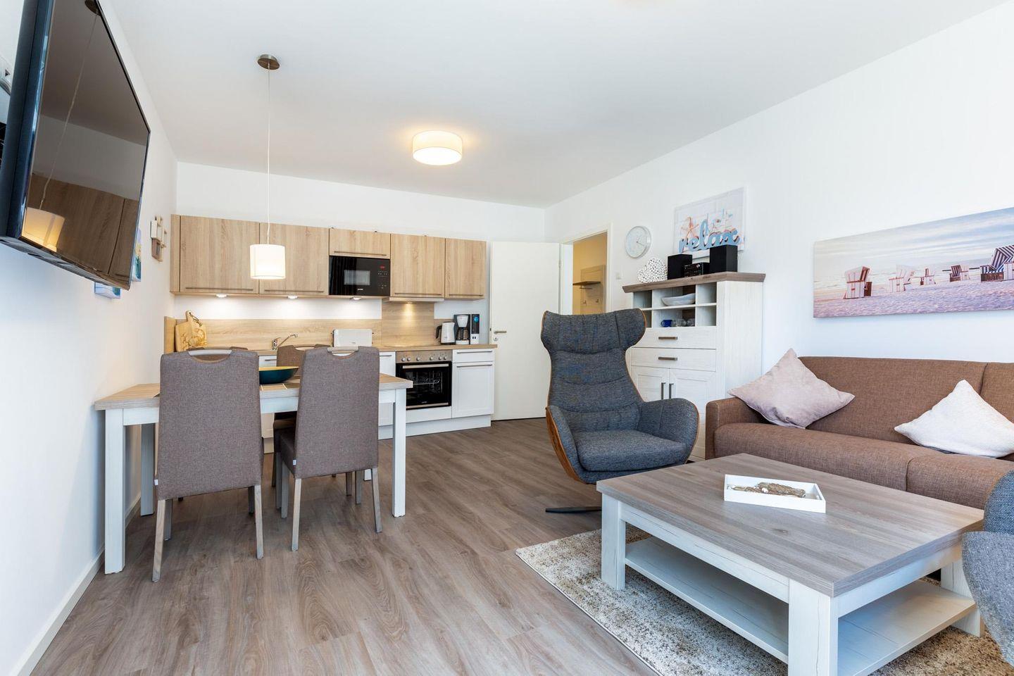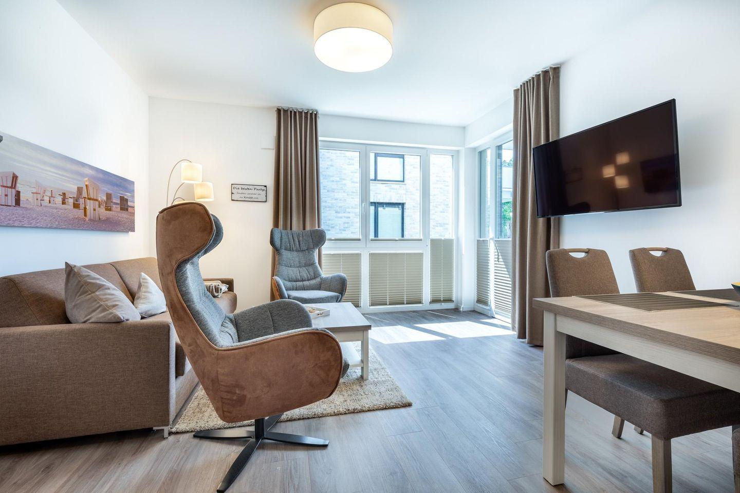 Das familienfreundliche und moderne Nichtraucher-Apartment verfügt über Fußbodenheizung, bodentiefe Fenster mit 3-fach Isolierung, kostenfreies WLAN und eine voll ausgestattete offene Küche mit Geschirrspüler, Gefrierfach, Kaffeemaschine, Toaster, Wasserkocher, Backofen und Mikrowelle sowie über einen Essbereich. Im Wohnbereich befindet sich eine Doppelschlafcouch (1,60 x 2,00 m) und ein großer Flatscreen-TV mit Blu-ray-Player. Das separate Schlafzimmer ist mit einem modernen Boxspringbett (1,80 x 2,00 m) und einem Flatscreen-TV ausgestattet. Ein Kinderbett kann gegen Entgelt im Wohnbereich aufgestellt werden und auf Wunsch könnt ihr einen Kinderhochstuhl hinzubuchen. Im stilvollen Badezimmer befinden sich eine ebenerdige Dusche, ein Waschtisch mit Föhn, Kosmetikspiegel und Handtuchheizkörper. Das Apartment verfügt über einen Flur mit Garderobe. Nach einem erholsamen Urlaubstag lässt es sich auf der mit Gartenmöbeln und Sonnenschirm ausgestatteten und sonnigen Terrasse, herrlich entspannen. Die Terrasse ist vom Wohnzimmer aus begehbar. Die Fenster des Apartments verfügen über Insektenschutz durch Fliegengitter.