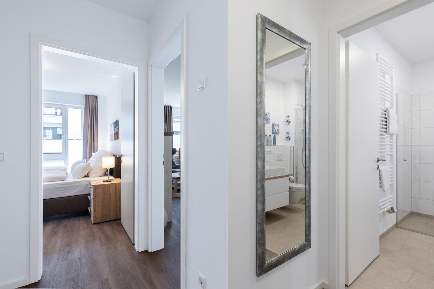 Das 57 m² große und barrierearme 2-Zimmer Apartment ist für bis zu 4 Personen geeignet. Besonders hervorzuheben ist die sonnenreiche und großzügige Terrasse in Süd-West Lage; hier lässt sich bis in den Abend hinein die Sonne und das milde Klima der Ostsee genießen.