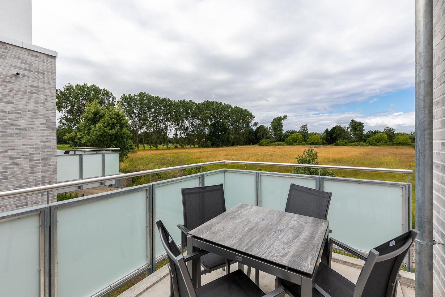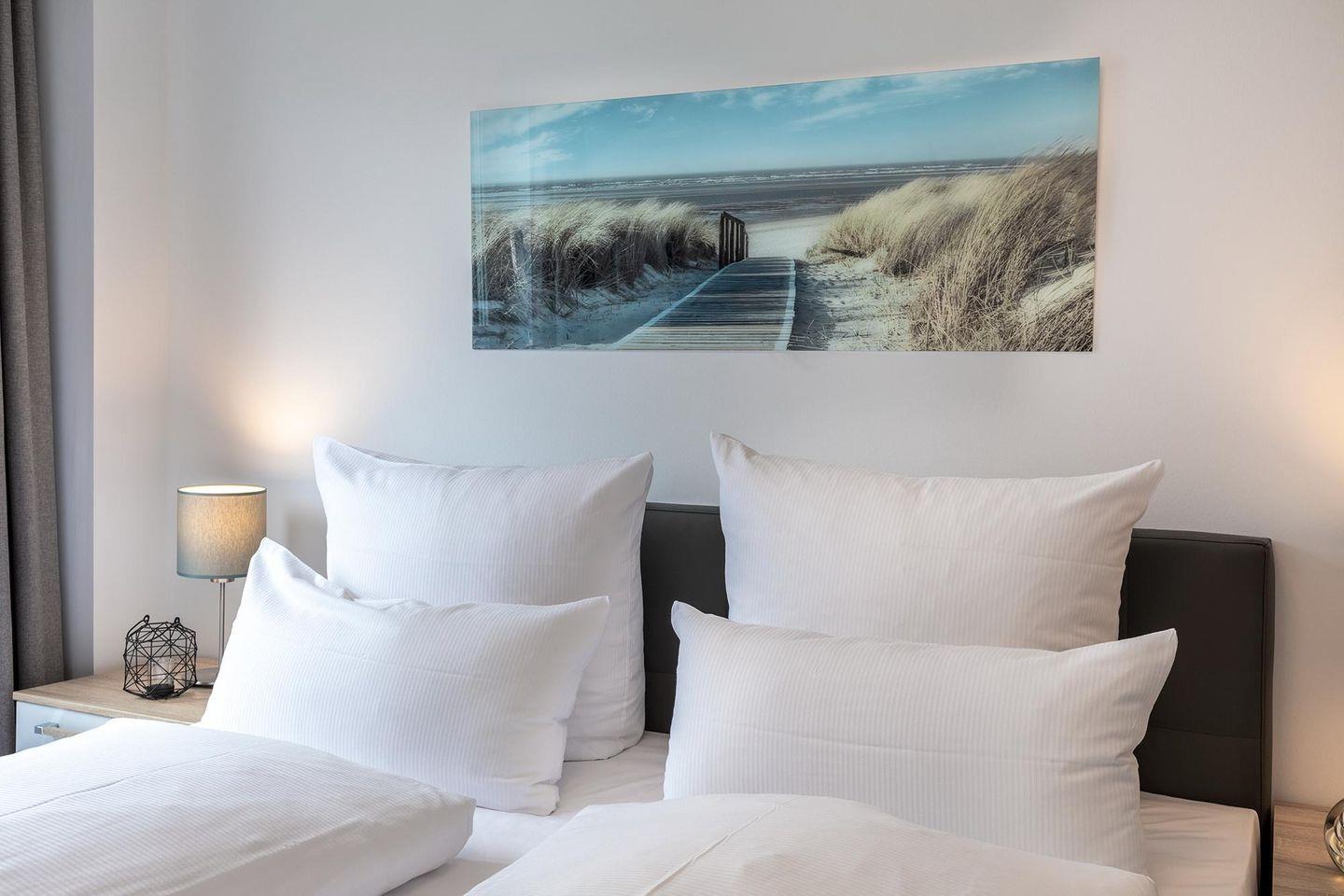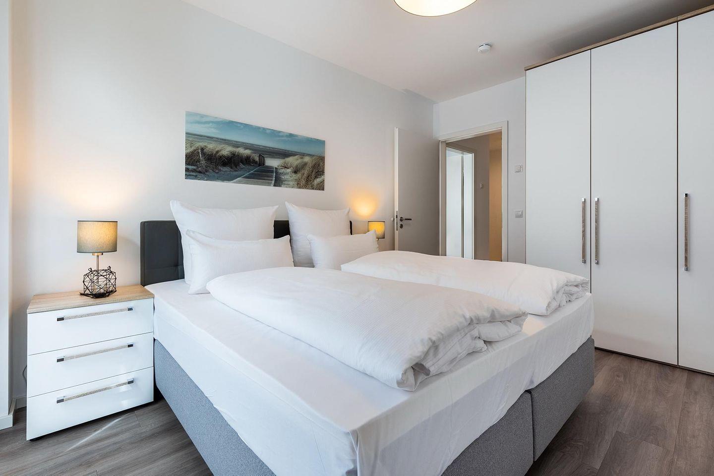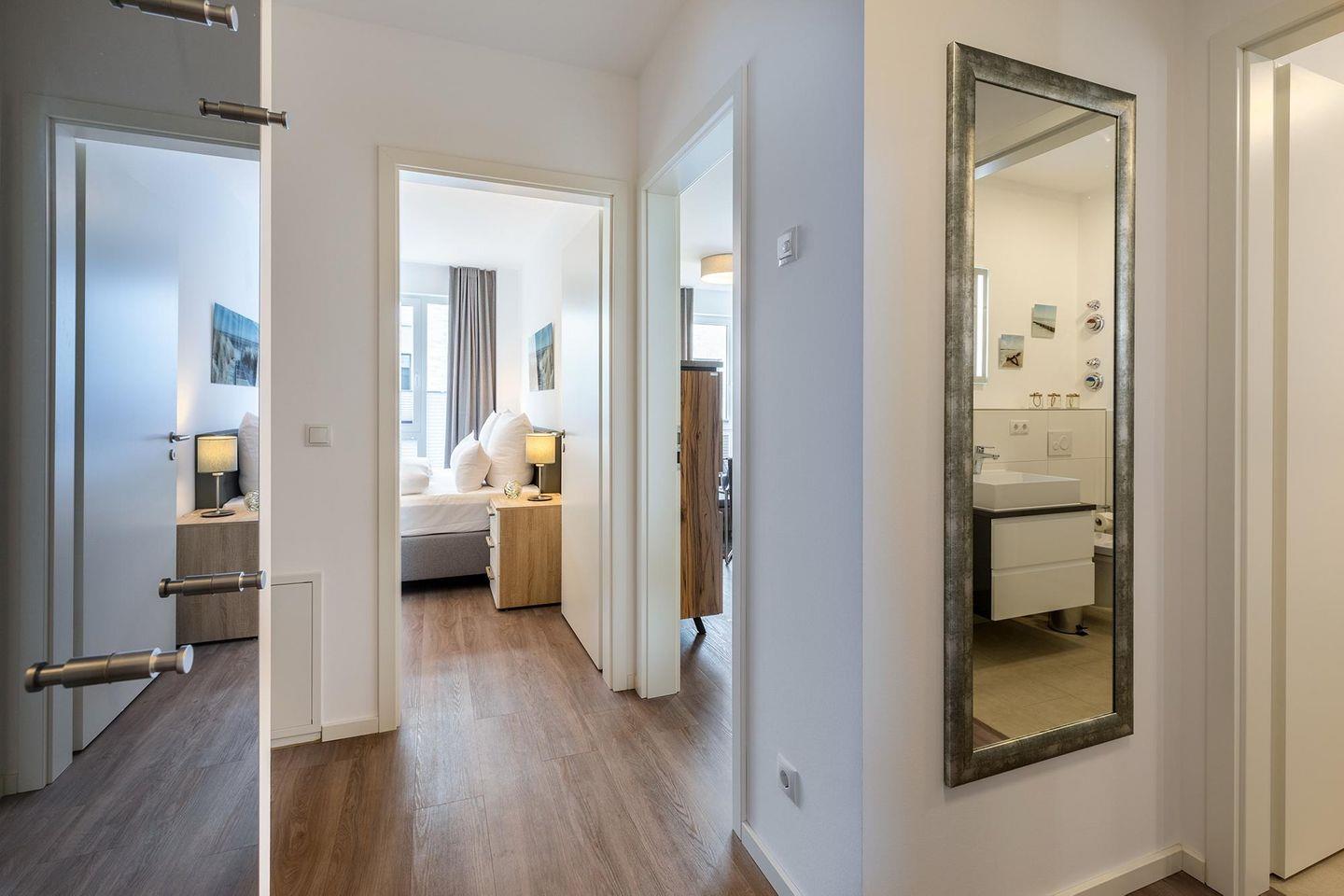 Das helle und moderne Nichtraucher-Apartment verfügt über Fußbodenheizung, bodentiefe Fenster mit 3-fach Isolierung, kostenfreies WLAN und eine voll ausgestattete offene Küche mit Geschirrspüler, Gefrierfach, Kaffeemaschine, Toaster, Wasserkocher, Backofen und Mikrowelle sowie über einen Essbereich. Im Wohnbereich befindet sich eine Doppelschlafcouch (1,60 x 2,00 m) und ein großer Flatscreen-TV mit Blu-ray-Player. Das separate Schlafzimmer ist mit einem modernen Boxspringbett (1,80 x 2,00 m) und einem Flatscreen-TV ausgestattet. Ein Kinderbett kann gegen Entgelt im Wohnbereich aufgestellt werden und auf Wunsch könnt ihr einen Kinderhochstuhl hinzubuchen. Im stilvollen Badezimmer befinden sich eine ebenerdige Dusche, ein Waschtisch mit Föhn, Kosmetikspiegel und Handtuchheizkörper. Das Apartment verfügt über einen Flur mit Garderobe. Auf dem mit Gartenmöbeln und Sonnenschirm ausgestatteten Balkon könnt ihr nach Lust und Laune die Sonne genießen, die hier bis in den Abend scheint. Der Balkon ist vom Wohnzimmer aus begehbar. Bis auf eine Schwelle zum Balkon, ist das Apartment barrierefrei konzipiert.