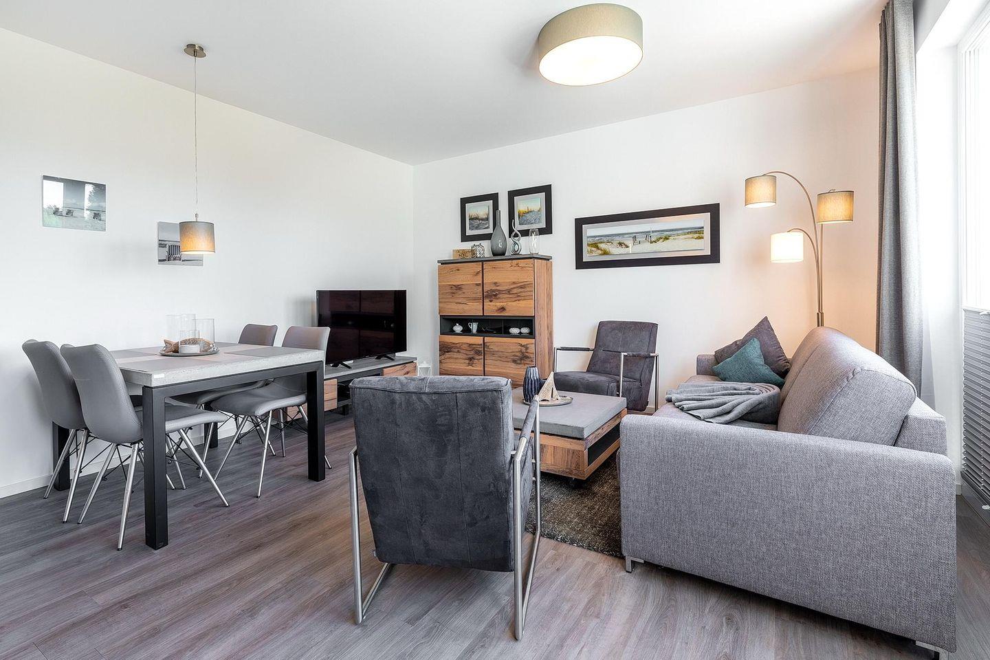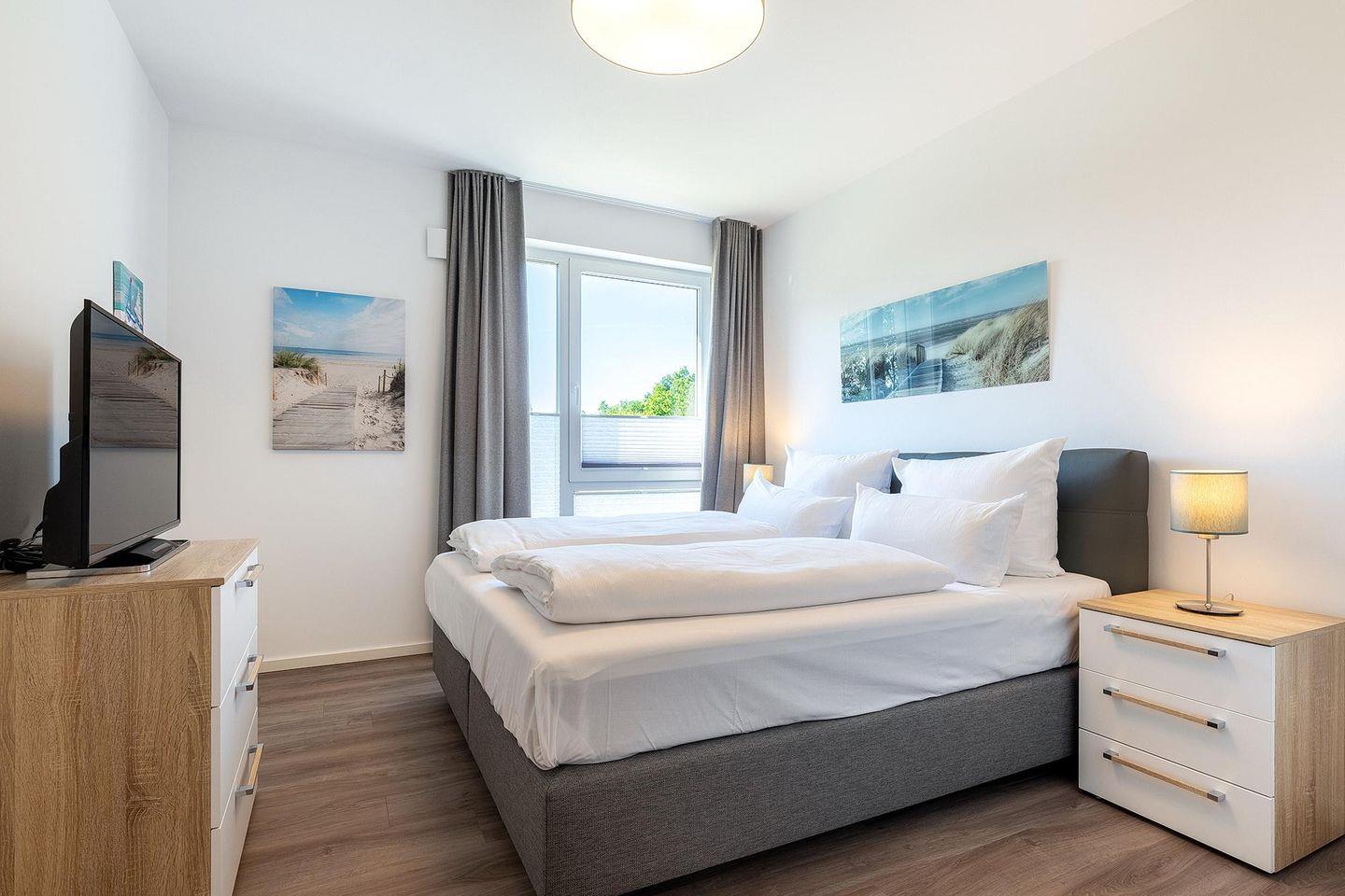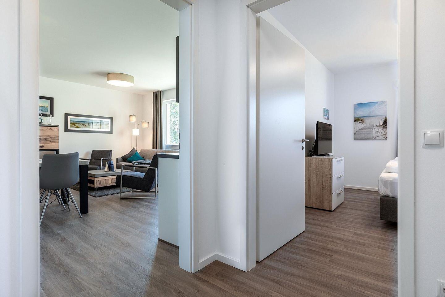 Das helle und moderne Nichtraucher-Apartment verfügt über Fußbodenheizung, bodentiefe Fenster mit 3-fach Isolierung, kostenfreies WLAN und eine voll ausgestattete offene Küche mit Geschirrspüler, Gefrierfach, Kaffeemaschine, Toaster, Wasserkocher, Backofen und Mikrowelle sowie über einen Essbereich. Im Wohnbereich befindet sich eine Doppelschlafcouch (1,60 x 2,00 m) und ein großer Flatscreen-TV mit Blu-ray-Player. Das separate Schlafzimmer ist mit einem modernen Boxspringbett (1,80 x 2,00 m) und einem Flatscreen-TV ausgestattet. Ein Kinderbett kann gegen Entgelt aufgestellt werden und auf Wunsch könnt ihr einen Kinderhochstuhl hinzubuchen. Im stilvollen Badezimmer befinden sich eine ebenerdige Dusche, ein Waschtisch mit Föhn, Kosmetikspiegel und Handtuchheizkörper. Das Apartment verfügt über einen Flur mit Garderobe. Auf dem mit Gartenmöbeln und Sonnenschirm ausgestatteten Balkon könnt ihr nach Lust und Laune die Sonne genießen, die hier bis in den Abend scheint. Der Balkon ist vom Wohnbereich aus begehbar. Bis auf eine Schwelle zum Balkon, ist das Apartment barrierefrei konzipiert.