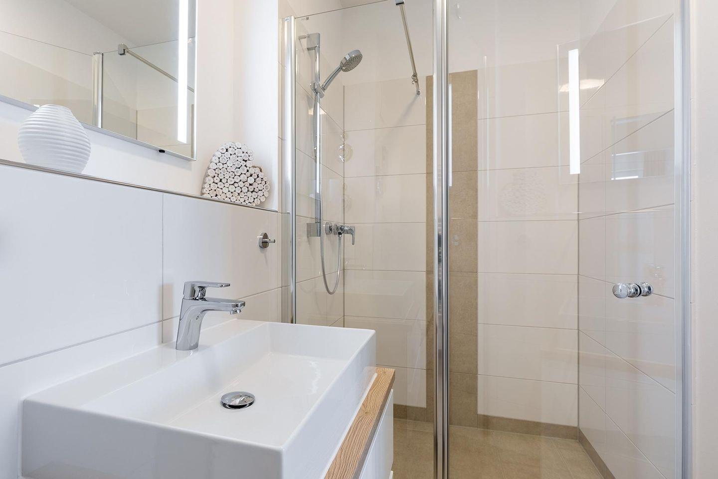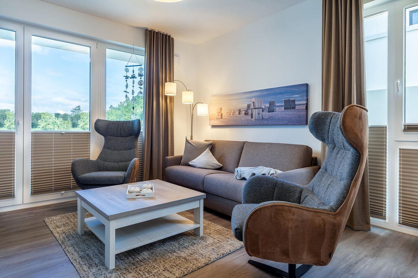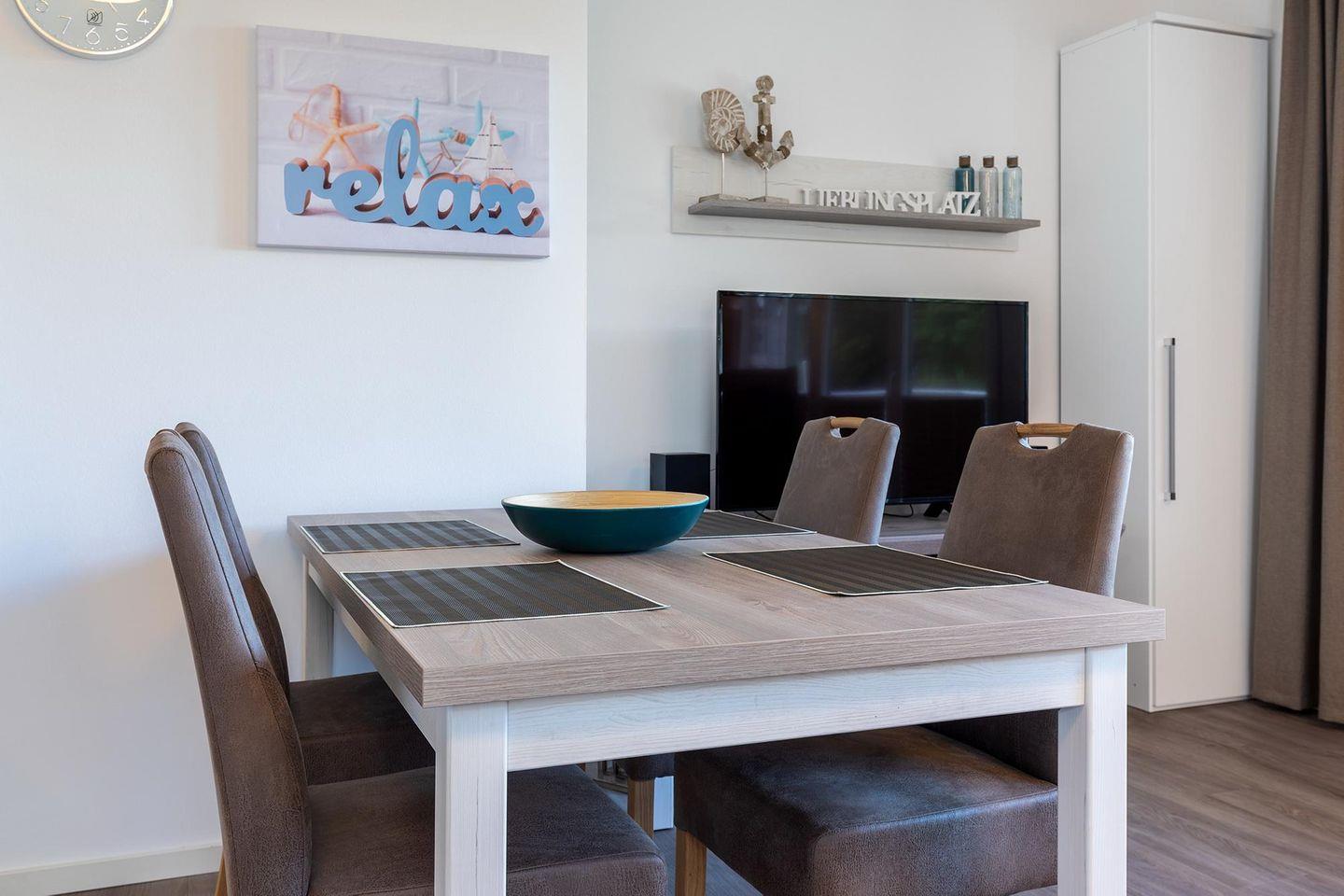 Das helle und moderne Nichtraucher-Apartment verfügt über Fußbodenheizung, bodentiefe Fenster mit 3-fach Isolierung, kostenfreies WLAN und eine voll ausgestattete offene Küche mit Geschirrspüler, Gefrierfach, Kaffeemaschine, Toaster, Wasserkocher, Backofen und Mikrowelle sowie über einen Essbereich. Im Wohnbereich befindet sich eine Doppelschlafcouch (1,60 x 2,00 m) und ein großer Flatscreen-TV mit Blu-ray-Player. Das separate Schlafzimmer ist mit einem modernen Boxspringbett (1,80 x 2,00 m) und einem Flatscreen-TV ausgestattet. Ein Kinderbett kann gegen Entgelt im Wohnbereich aufgestellt werden und auf Wunsch könnt ihr einen Kinderhochstuhl hinzubuchen. Im stilvollen Badezimmer befinden sich eine ebenerdige Dusche, ein Waschtisch mit Föhn, Kosmetikspiegel und Handtuchheizkörper. Das Apartment verfügt über einen Flur mit Garderobe. Auf dem mit Gartenmöbeln und Sonnenschirm ausgestatteten Balkon könnt ihr nach Lust und Laune die Sonne genießen, die hier bis in den Abend scheint. Der Balkon ist vom Wohnbereich aus begehbar. Bis auf eine Schwelle zum Balkon, ist das Apartment barrierefrei konzipiert.