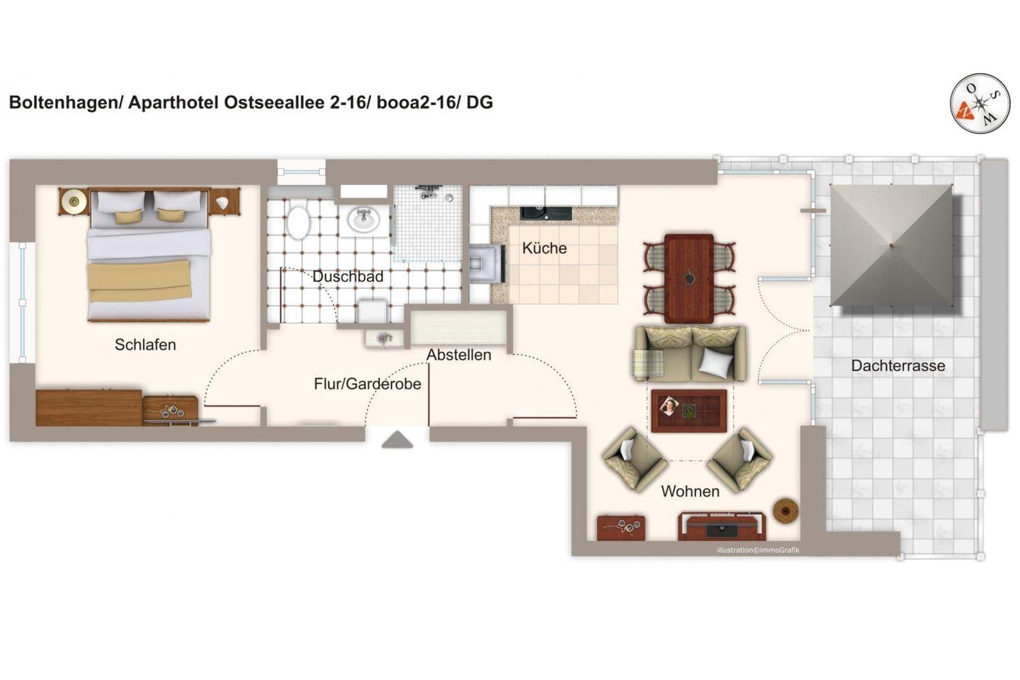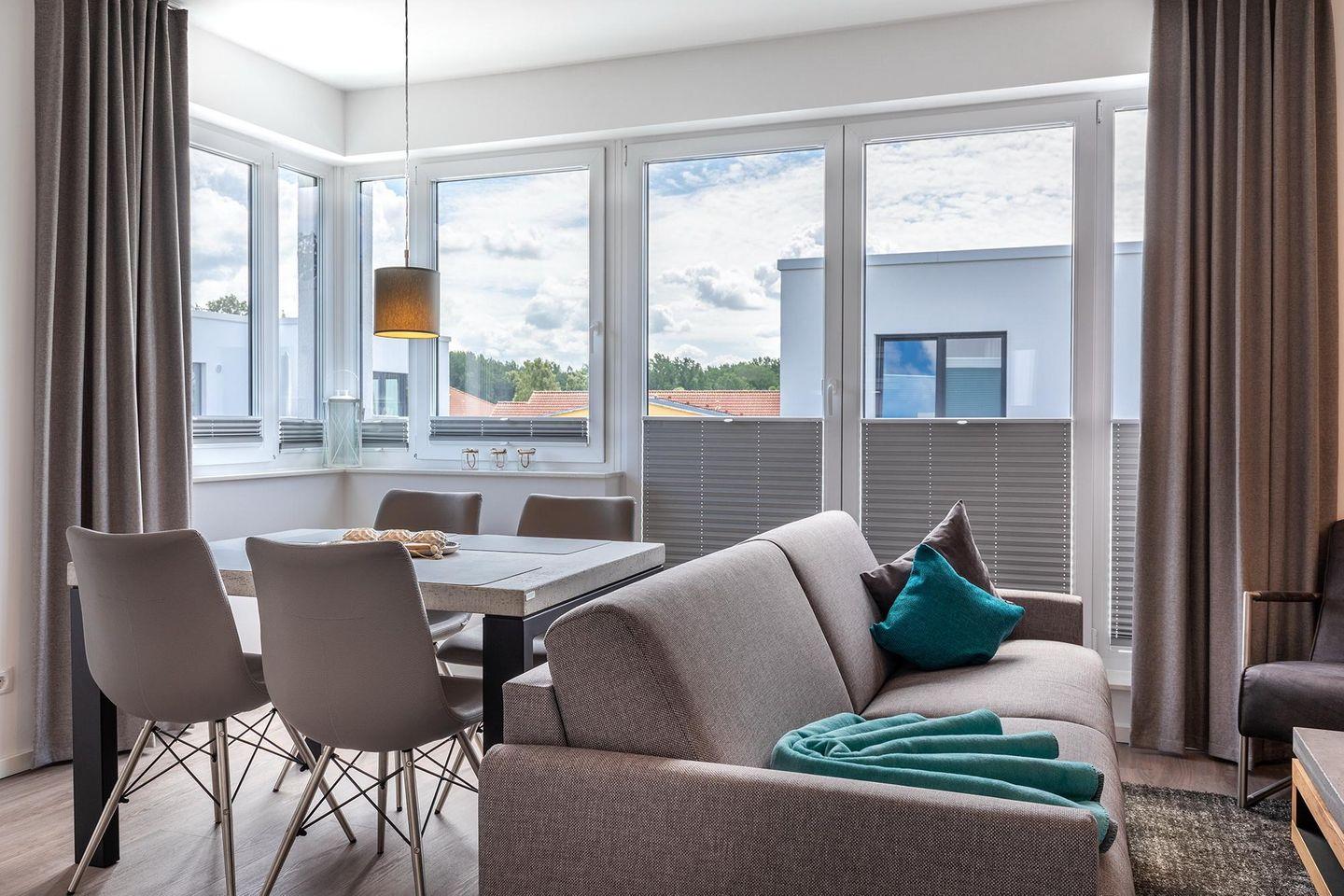 Das helle und moderne Nichtraucher-Apartment verfügt über Fußbodenheizung, bodentiefe Fenster mit 3-fach Isolierung, kostenfreies WLAN und eine voll ausgestattete offene Küche mit Geschirrspüler, Gefrierfach, Kaffeemaschine, Toaster, Wasserkocher, Backofen und Mikrowelle sowie über einen Essbereich. Im Wohnbereich befindet sich eine Doppelschlafcouch (1,60 x 2,00 m) und ein großer Flatscreen-TV mit Blu-Ray-Player. Das separate Schlafzimmer ist mit einem modernen Boxspringbett (1,80 x 2,00 m) und einem 2. Flatscreen-TV ausgestattet. Im stilvollen Badezimmer befinden sich eine ebenerdige Dusche, ein Waschtisch mit Föhn, Kosmetikspiegel und Handtuchheizkörper. Das Apartment verfügt über einen Flur mit Garderobe. Auf der mit Gartenmöbeln und Sonnenschirm ausgestatteten sonnigen Dachterrasse könnt ihr nach Lust und Laune eure Urlaubstage genießen. Die Dachterrasse ist vom Wohnbereich aus begehbar. Von hier aus habt ihr einen einmaligen Blick in den nahen Küstenwald in nordöstlicher Richtung und in das Landschaftsschutzgebiet Tarnewitzer Urwald in südlicher Richtung. Bis auf eine Schwelle zur Dachterrasse, ist das Apartment barrierefrei konzipiert.