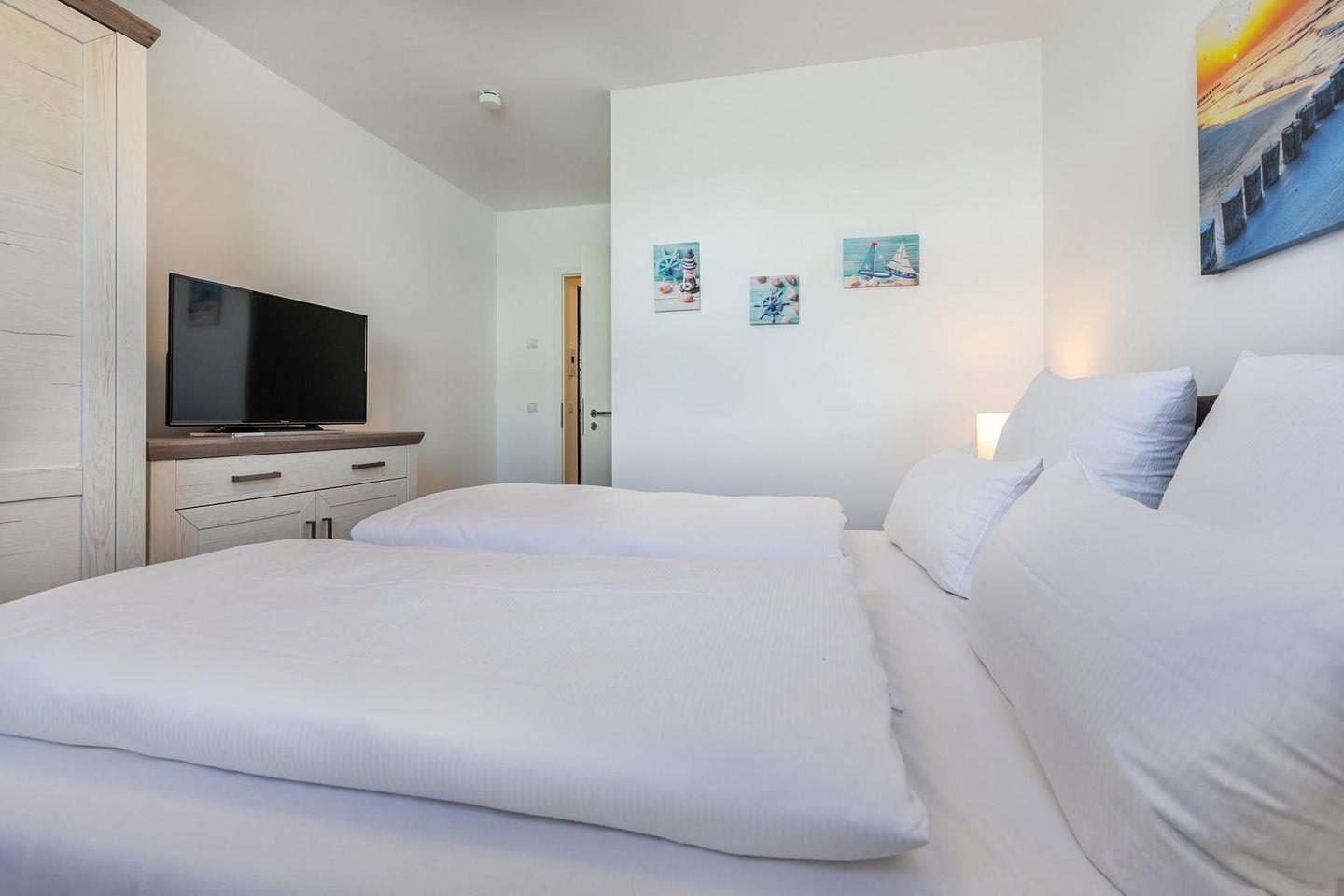 Das helle und moderne Nichtraucher-Apartment verfügt über Fußbodenheizung, bodentiefe Fenster mit 3-fach Isolierung, kostenfreies WLAN und eine voll ausgestattete offene Küche mit Geschirrspüler, Gefrierfach, Kaffeemaschine, Toaster, Wasserkocher, Backofen und Mikrowelle sowie über einen Essbereich. Im Wohnbereich befindet sich eine Doppelschlafcouch (1,60 x 2,00 m) und ein großer Flatscreen-TV mit Blu-ray-Player. Beide separaten Schlafzimmer sind jeweils mit einem modernen Boxspringbett (1,80 x 2,00 m) und Flatscreen-TV ausgestattet. Ein Kinderbett kann gegen Entgelt aufgestellt werden und auf Wunsch könnt ihr einen Kinderhochstuhl hinzubuchen. Das beiden stilvollen Badezimmer verfügen jeweils über eine ebenerdige Dusche, WC, Waschtisch, Föhn, Kosmetikspiegel und Handtuchheizkörper. Das Apartment besitzt einen geräumigen Flur mit Garderobe. Auf der mit Gartenmöbeln und Sonnenschirm ausgestatteten Dachterrasse, lässt sich herrlich entspannen, sonnenbaden und gesellig beisammen sitzen. Von hier aus habt ihr einen einmaligen Blick in den nahen Küstenwald in nordöstlicher Richtung und in das Landschaftsschutzgebiet Tarnewitzer Urwald in südlicher Richtung. Die Dachterrasse ist vom Wohnbereich aus begehbar. Bis auf eine Schwelle zur Terrasse ist das Apartment barrierefrei konzipiert.