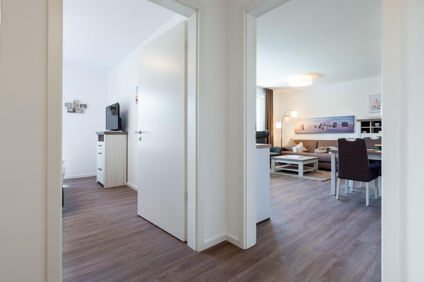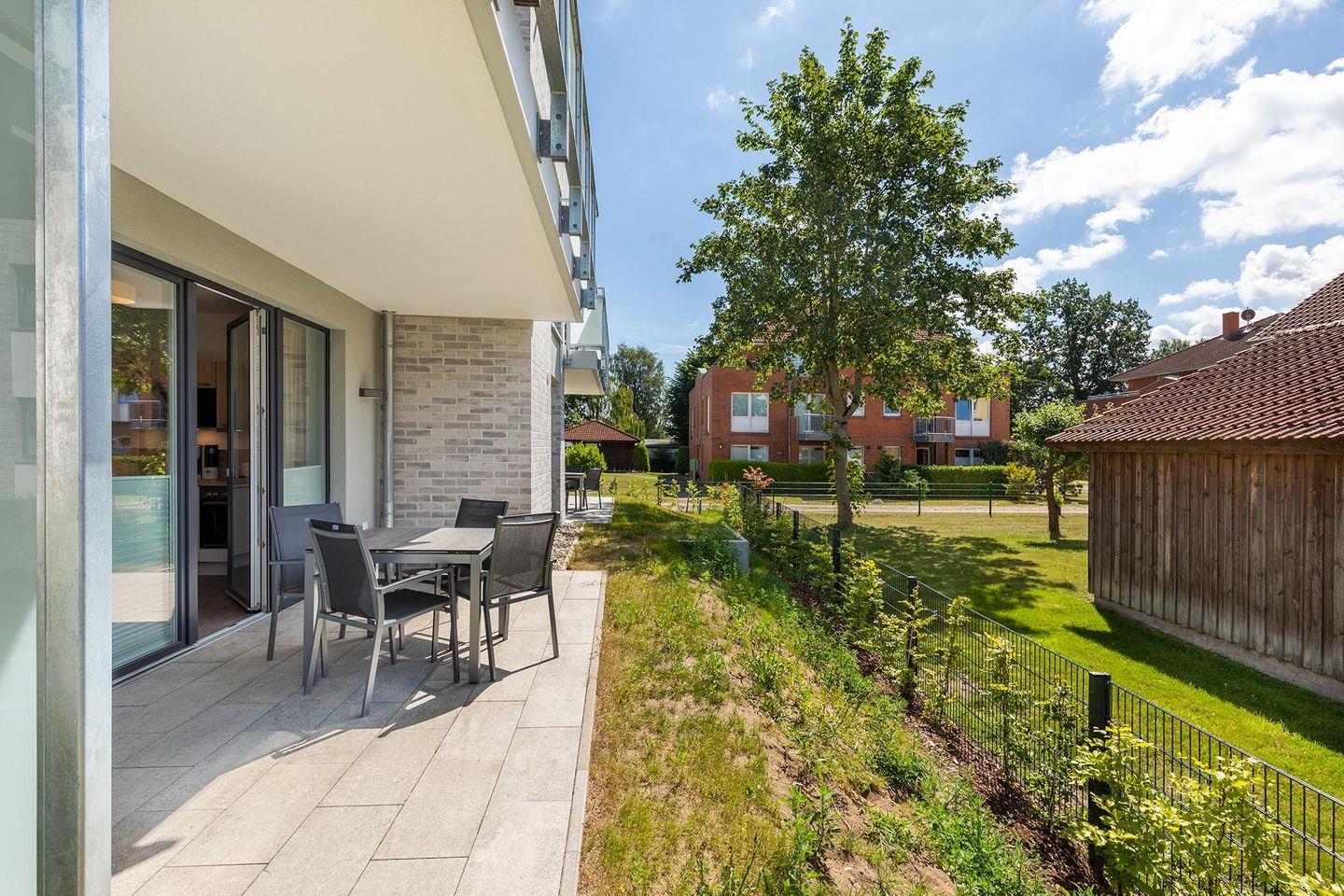 Das familienfreundliche und moderne Nichtraucher-Apartment verfügt über Fußbodenheizung, bodentiefe Fenster mit 3-fach Isolierung, kostenfreies WLAN und eine voll ausgestattete offene Küche mit Geschirrspüler, Gefrierfach, Kaffeemaschine, Toaster, Wasserkocher, Backofen und Mikrowelle sowie über einen Essbereich. Im Wohnbereich befindet sich eine Doppelschlafcouch (1,60 x 2,00 m) und ein großer Flatscreen-TV mit Blu-ray-Player. Das separate Schlafzimmer ist mit einem modernen Boxspringbett (1,80 x 2,00 m) und einem Flatscreen-TV ausgestattet. Ein Kinderbett kann gegen Entgelt aufgestellt werden und auf Wunsch könnt ihr einen Kinderhochstuhl hinzubuchen. Im stilvollen Badezimmer befinden sich eine ebenerdige Dusche, ein Waschtisch mit Föhn, Kosmetikspiegel und Handtuchheizkörper. Das Apartment verfügt über einen Flur mit Garderobe. Nach einem erholsamen Urlaubstag lässt es sich auf der mit Gartenmöbeln und Sonnenschirm ausgestatteten und sonnigen Terrasse, herrlich entspannen. Die Terrasse ist vom Wohnzimmer aus begehbar.