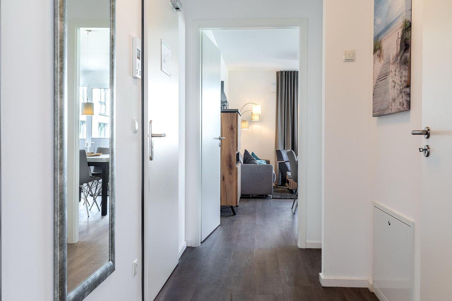 Das 58 m² große und barrierearme 2-Zimmer Apartment ist für bis zu 4 Personen geeignet. Besonders hervorzuheben ist die großzügige Terrasse in Nord-West Lage; hier könnt ihr erholsame Stunden im wohltuenden Klima der Ostsee verbringen und den Tag in der Abendsonne gemütlich ausklingen lassen.
