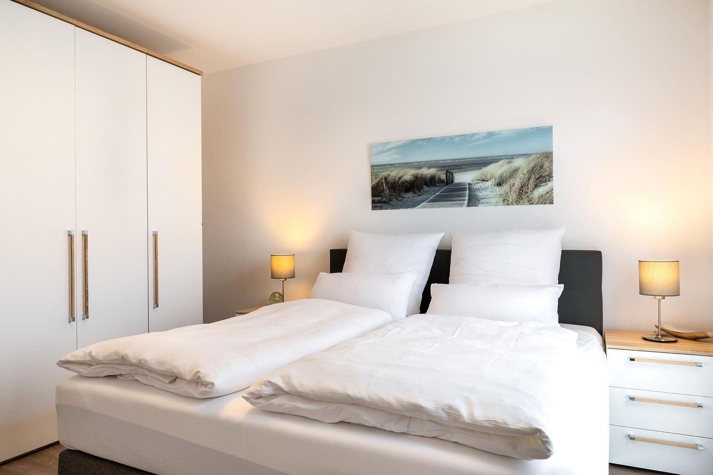 Das familienfreundliche und moderne Nichtraucher-Apartment verfügt über Fußbodenheizung, bodentiefe Fenster mit 3-fach Isolierung, kostenfreies WLAN und eine voll ausgestattete offene Küche mit Geschirrspüler, Gefrierfach, Kaffeemaschine, Toaster, Wasserkocher, Backofen und Mikrowelle sowie über einen Essbereich. Im Wohnbereich befindet sich eine Doppelschlafcouch (1,60 x 2,00 m) und ein großer Flatscreen-TV mit Blu-ray-Player. Das separate Schlafzimmer ist mit einem modernen Boxspringbett (1,80 x 2,00 m) und einem Flatscreen-TV ausgestattet. Ein Kinderbett kann gegen Entgelt aufgestellt werden und auf Wunsch könnt ihr einen Kinderhochstuhl hinzubuchen. Im stilvollen Badezimmer befinden sich eine ebenerdige Dusche, ein Waschtisch mit Föhn, Kosmetikspiegel und Handtuchheizkörper. Das Apartment verfügt über einen Flur mit Garderobe. Nach einem erholsamen Urlaubstag lässt es sich auf der mit Gartenmöbeln und Sonnenschirm ausgestatteten und sonnigen Terrasse, herrlich entspannen. Die Terrasse ist vom Wohnzimmer aus begehbar.