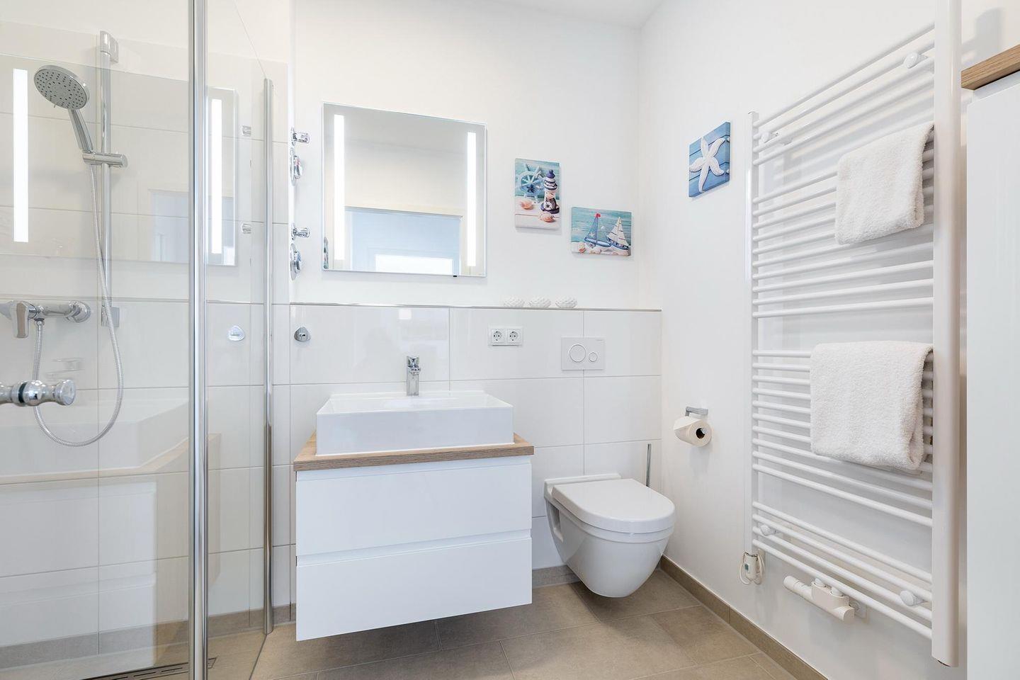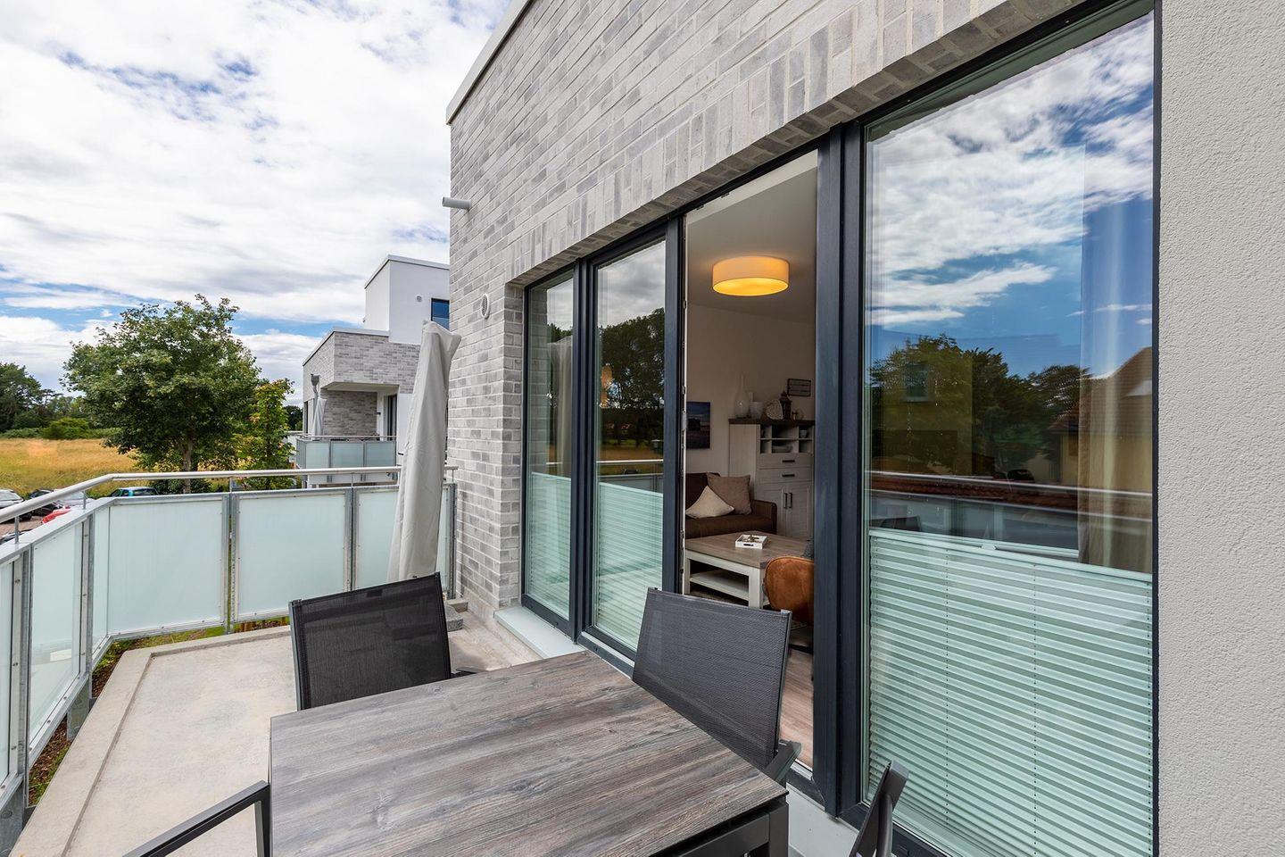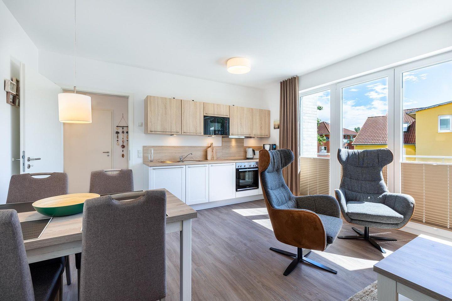 Das helle und moderne Nichtraucher-Apartment verfügt über Fußbodenheizung, bodentiefe Fenster mit 3-fach Isolierung, kostenfreies WLAN und eine voll ausgestattete offene Küche mit Geschirrspüler, Gefrierfach, Kaffeemaschine, Toaster, Wasserkocher, Backofen und Mikrowelle sowie über einen Essbereich. Im Wohnbereich befindet sich eine Doppelschlafcouch (1,60 x 2,00 m) und ein großer Flatscreen-TV mit Blu-ray-Player. Das separate Schlafzimmer ist mit einem modernen Boxspringbett (1,80 x 2,00 m) und einem Flatscreen-TV ausgestattet. Ein Kinderbett kann gegen Entgelt aufgestellt werden und auf Wunsch könnt ihr einen Kinderhochstuhl hinzubuchen. Im stilvollen Badezimmer befinden sich eine ebenerdige Dusche, ein Waschtisch mit Föhn, Kosmetikspiegel und Handtuchheizkörper. Das Apartment verfügt über einen Flur mit Garderobe. Auf dem mit Gartenmöbeln und Sonnenschirm ausgestatteten Balkon könnt ihr den ganzen Tag das Meeresklima der nahen Ostsee genießen. Der Balkon ist vom Wohnzimmer aus begehbar. Bis auf eine Schwelle zum Balkon ist das Apartment barrierefrei konzipiert.