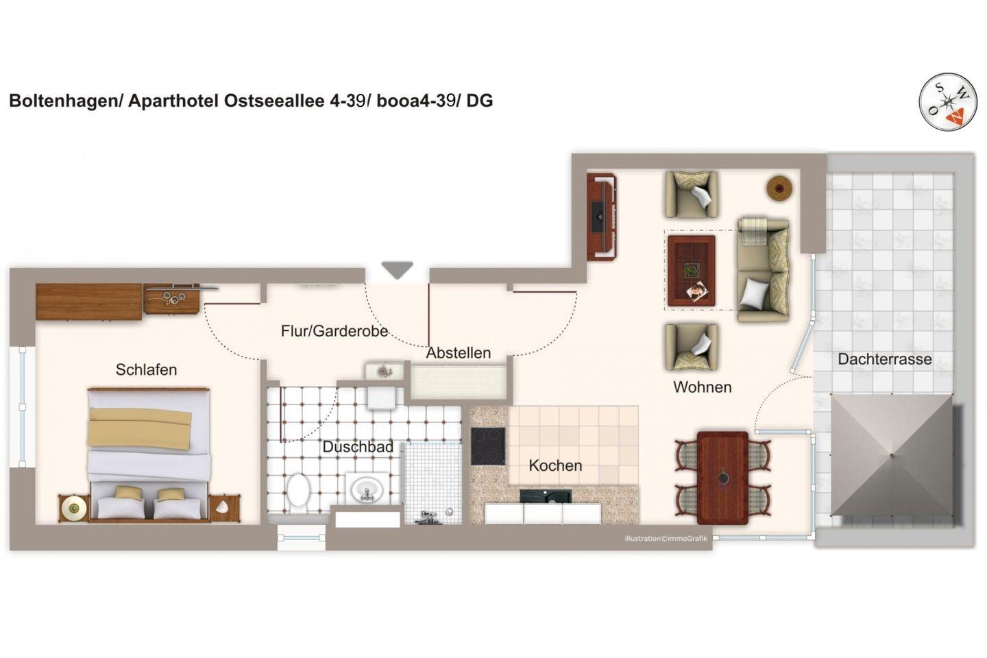 Das exklusive und lichtdurchflutete Apartment befindet sich in wesltlicher Lage im Dachgeschoss, dem Staffelgeschoss von Haus 4. Die Ostsee liegt praktisch vor der Haustür - in nur 200 Metern erreicht ihr den feinsandigen, kilometerlangen Strand Boltenhagens. Die Seebrücke und der Kurpark sind nur wenige Gehminuten entfernt. In der unmittelbaren Umgebung findet ihr Einkaufsmöglichkeiten, Restaurants und Cafés sowie zahlreiche Freizeitangebote und Ausflugsziele. Wander-und Radwege, ein Kletterpark, Wellness- und Fitnesseinrichtungen sowie vielseitige Veranstaltungen, wie z.B. das beliebte Seebrückenfest, garantieren einen erlebnisreichen Urlaub für die ganze Familie.