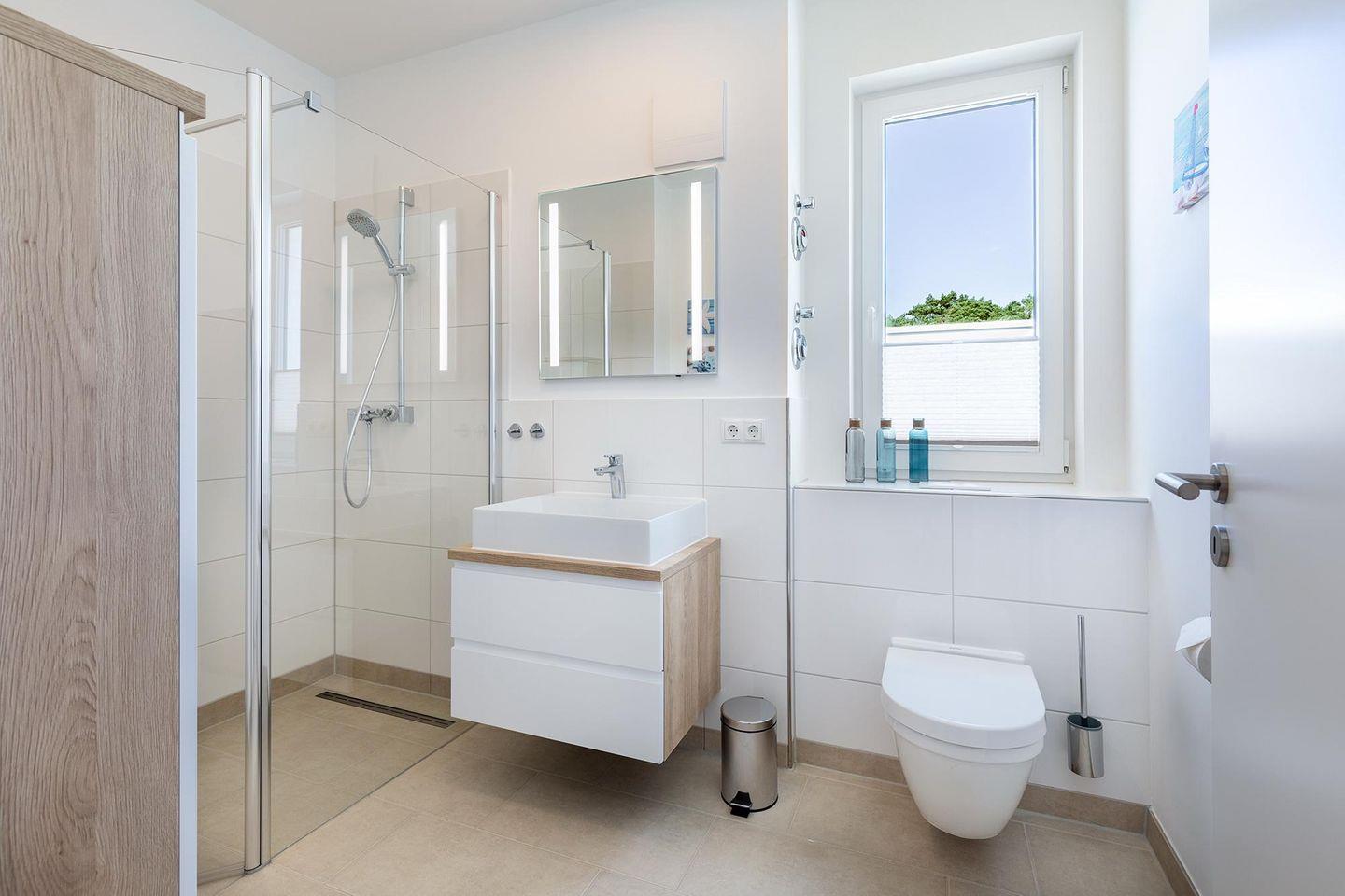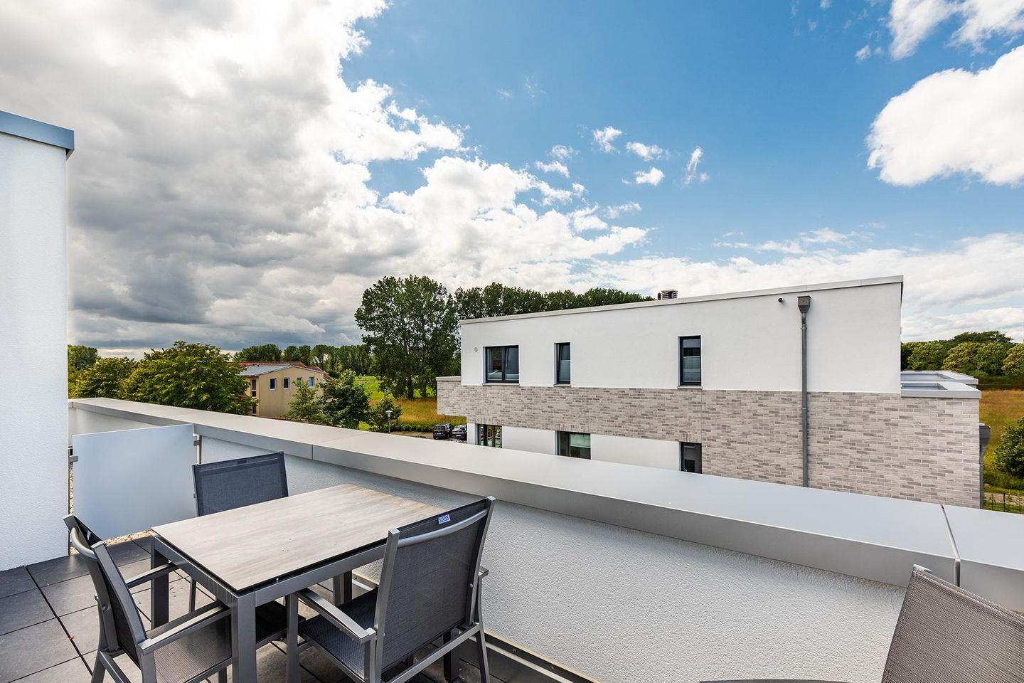Auf der mit Gartenmöbeln und Sonnenschirm ausgestatteten Dachterrasse, lässt sich herrlich entspannen, sonnenbaden und gesellig beisammen sitzen. Von hier aus habt ihr einen einmaligen Blick in den nahen Küstenwald in nordöstlicher Richtung und in das Landschaftsschutzgebiet Tarnewitzer Urwald in südlicher Richtung. Die Dachterrasse ist vom Wohnbereich aus begehbar. Bis auf eine Schwelle zur Terrasse ist das Apartment barrierefrei konzipiert.