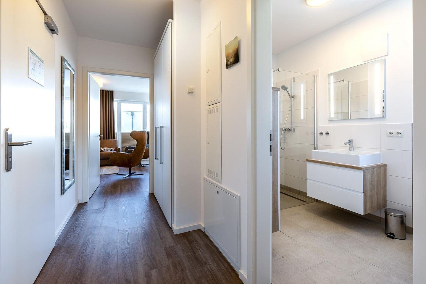 Das helle und moderne Nichtraucher-Apartment verfügt über Fußbodenheizung, bodentiefe Fenster mit 3-fach Isolierung, kostenfreies WLAN und eine voll ausgestattete offene Küche mit Geschirrspüler, Gefrierfach, Kaffeemaschine, Toaster, Wasserkocher, Backofen und Mikrowelle sowie über einen Essbereich. Im Wohnbereich befindet sich eine Doppelschlafcouch (1,60 x 2,00 m) und ein großer Flatscreen-TV mit Blu-ray-Player. Das separate Schlafzimmer ist mit einem modernen Boxspringbett (1,80 x 2,00 m) und Flatscreen-TV ausgestattet. Das großzügig konzipierte und stilvolle Badezimmer verfügt über eine ebenerdige Dusche, WC, Waschtisch, Föhn, Kosmetikspiegel und Handtuchheizkörper. Das Apartment verfügt über einen geräumigen Flur mit Garderobe.