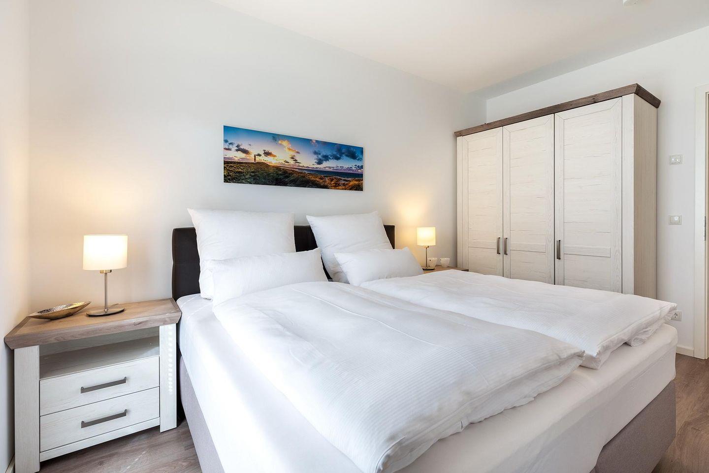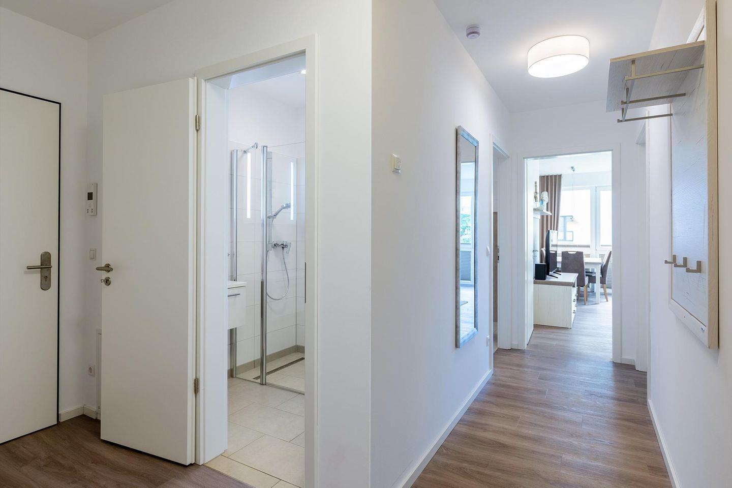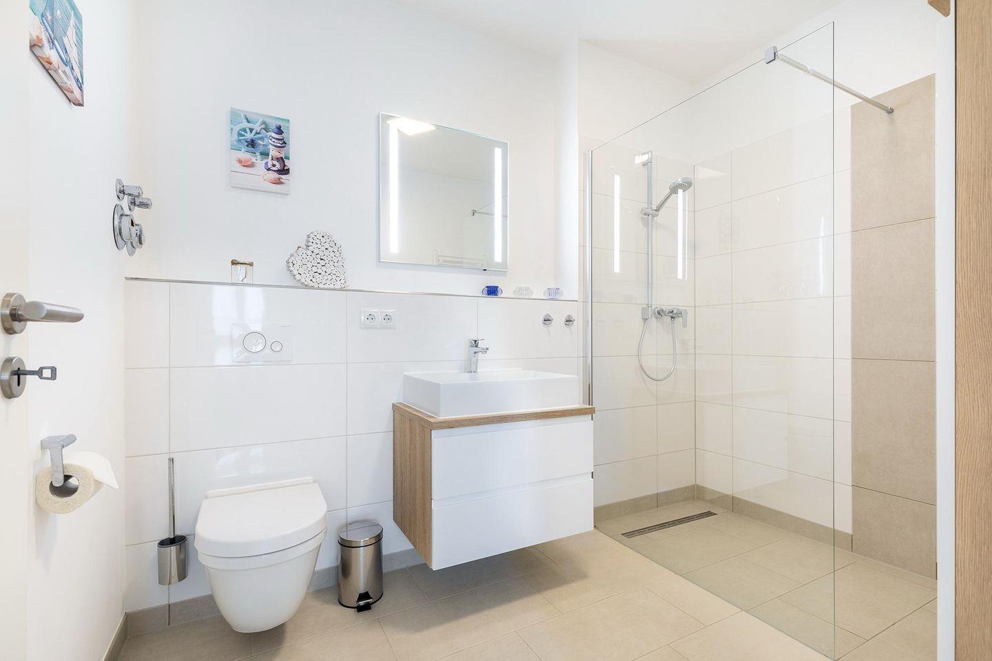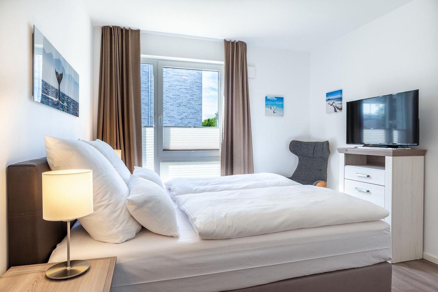 Das familienfreundliche und moderne Nichtraucher-Apartment verfügt über Fußbodenheizung, bodentiefe Fenster mit 3-fach Isolierung, kostenfreies WLAN und eine voll ausgestattete offene Küche mit Geschirrspüler, Gefrierfach, Kaffeemaschine, Toaster, Wasserkocher, Backofen und Mikrowelle sowie über einen Essbereich. Im Wohnbereich befindet sich eine Doppelschlafcouch (1,60 x 2,00 m) und ein großer Flatscreen-TV mit Blu-ray-Player. Beide separaten Schlafzimmer sind jeweils mit einem modernen Boxspringbett (1,80 x 2,00 m) Flatscreen-TV ausgestattet. Ein Kinderbett kann gegen Entgelt im Wohnbereich aufgestellt werden und auf Wunsch könnt ihr einen Kinderhochstuhl hinzubuchen. Die stilvollen Badezimmer verfügen jeweils über eine ebenerdige Dusche, WC, Waschtisch, Föhn, Kosmetikspiegel und Handtuchheizkörper. Das Apartment verfügt über einen großzügigen Flur mit Garderobe. Auf der mit Gartenmöbeln und Sonnenschirm ausgestatteten, sonnenreichen Terrasse lässt sich herrlich entspannen, sonnenbaden und gesellig beisammen sitzen. Die Terrasse ist vom Wohn-Essbereich aus begehbar.