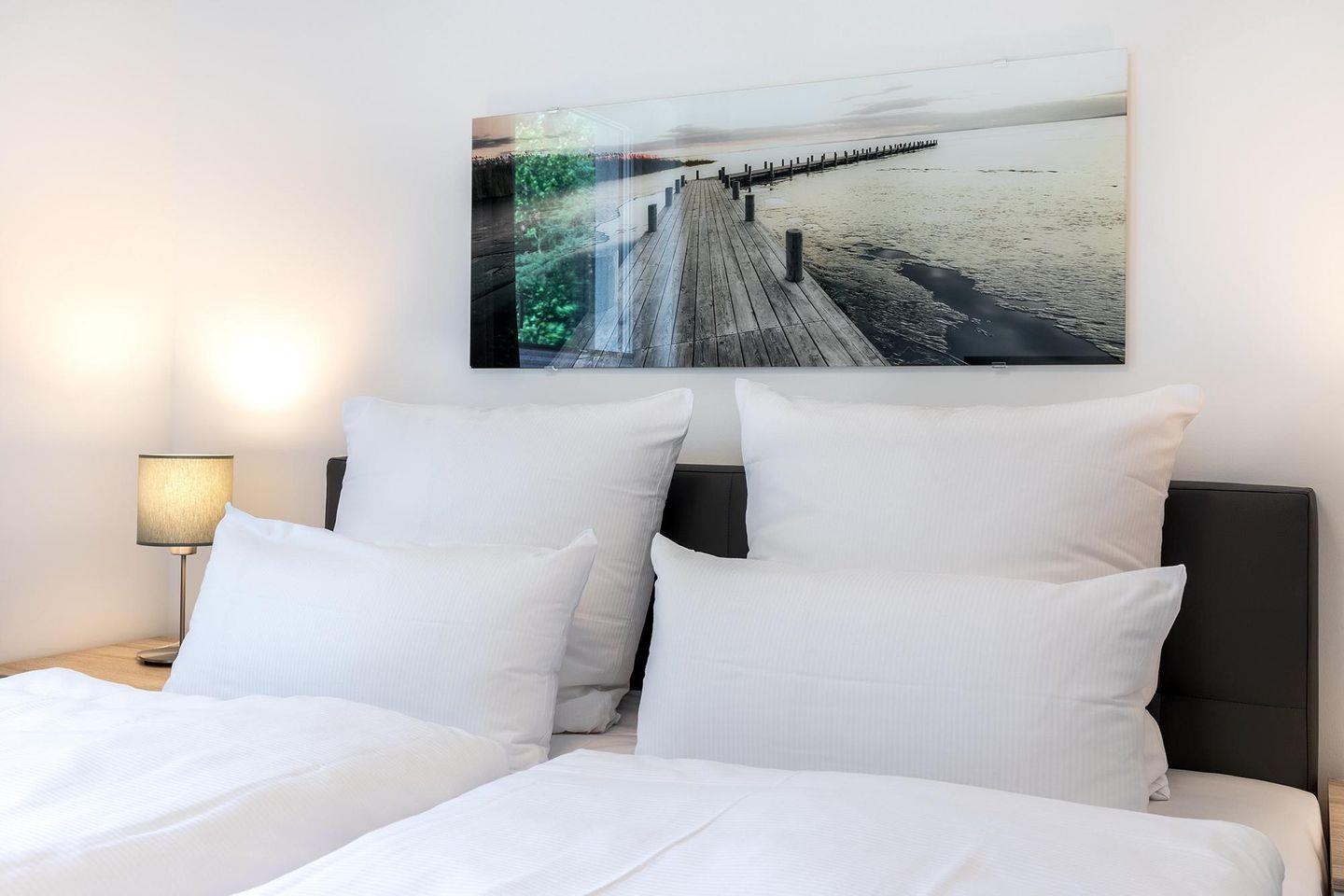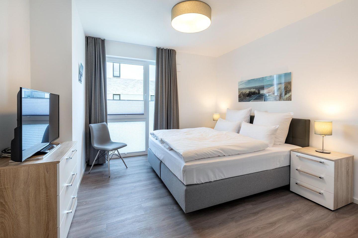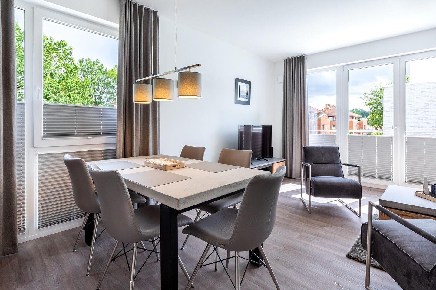 Das helle und moderne Nichtraucher-Apartment verfügt über Fußbodenheizung, bodentiefe Fenster mit 3-fach Isolierung, kostenfreies WLAN und eine voll ausgestattete offene Küche mit Geschirrspüler, Gefrierfach, Kaffeemaschine, Toaster, Wasserkocher, Backofen und Mikrowelle sowie über einen Essbereich. Im großzügig konzipierten Wohnbereich befindet sich eine Doppelschlafcouch (1,60 x 2,00 m) und ein großer Flatscreen-TV mit Blu-ray-Player. Beide separaten Schlafzimmer sind jeweils mit einem modernen Boxspringbett (1,80 x 2,00 m) und Flatscreen-TV ausgestattet. Ein Kinderbett kann gegen Entgelt aufgestellt werden und auf Wunsch könnt ihr einen Kinderhochstuhl hinzubuchen. Die stilvollen Badezimmer verfügen jeweils über eine ebenerdige Dusche, WC, Waschtisch, Föhn, Kosmetikspiegel und Handtuchheizkörper. Das Apartment verfügt über einen großzügigen Flur mit Garderobe. Auf derm mit Gartenmöbeln und Sonnenschirm ausgestatteten Balkon lässt sich herrlich entspannen, sonnenbaden und gesellig beisammen sitzen. Der Balkon ist vom Wohn-Essbereich aus begehbar. Bis auf eine Schwelle zum Balkon ist das Apartment barrierefrei konzipiert.