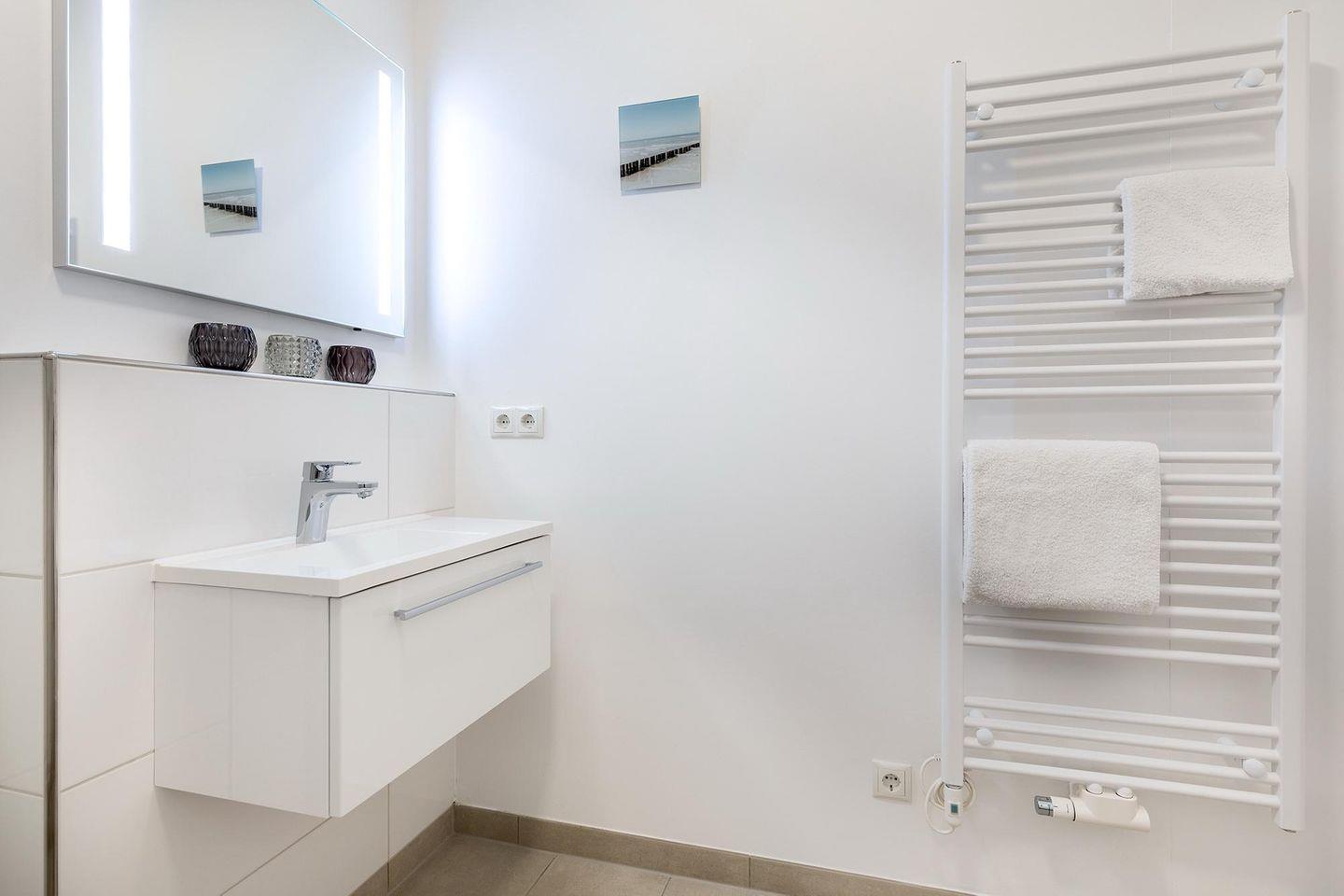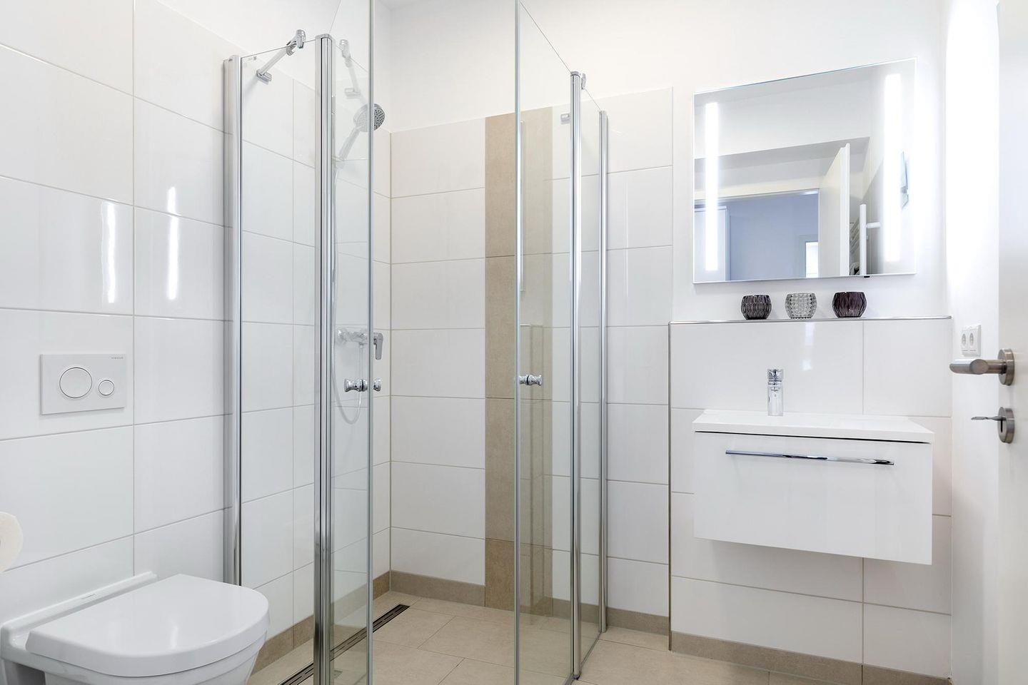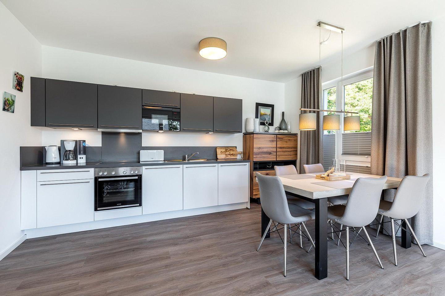 Das helle und moderne Nichtraucher-Apartment verfügt über Fußbodenheizung, bodentiefe Fenster mit 3-fach Isolierung, kostenfreies WLAN und eine voll ausgestattete offene Küche mit Geschirrspüler, Gefrierfach, Kaffeemaschine, Toaster, Wasserkocher, Backofen und Mikrowelle sowie über einen Essbereich. Im großzügig konzipierten Wohnbereich befindet sich eine Doppelschlafcouch (1,60 x 2,00 m) und ein großer Flatscreen-TV mit Blu-ray-Player. Beide separaten Schlafzimmer sind jeweils mit einem modernen Boxspringbett (1,80 x 2,00 m) und Flatscreen-TV ausgestattet. Ein Kinderbett kann gegen Entgelt aufgestellt werden und auf Wunsch könnt ihr einen Kinderhochstuhl hinzubuchen. Die stilvollen Badezimmer verfügen jeweils über eine ebenerdige Dusche, WC, Waschtisch, Föhn, Kosmetikspiegel und Handtuchheizkörper. Das Apartment verfügt über einen großzügigen Flur mit Garderobe. Auf derm mit Gartenmöbeln und Sonnenschirm ausgestatteten Balkon lässt sich herrlich entspannen, sonnenbaden und gesellig beisammen sitzen. Der Balkon ist vom Wohn-Essbereich aus begehbar. Bis auf eine Schwelle zum Balkon ist das Apartment barrierefrei konzipiert.